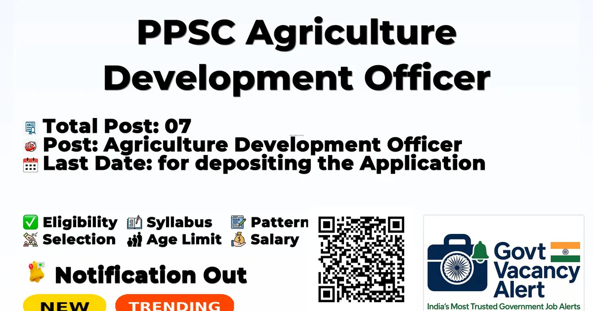The Punjab Public Service Commission (PPSC) Recruitment 2025 for 07 posts of Agriculture Development Officer. Candidates with B.Sc Can Apply Online. The online application opens on 10-09-2025, and closes on 30-09-2025. The candidate shall apply online through PPSC website, ppsc.gov.in. The PPSC Agriculture Development Officer Recruitment 2025 Notification PDF has been released on 10-09-2025 at ppsc.gov.in. Check the complete job details, vacancy, age limit, application fee, selection process and how to apply from the article. You can Check all Latest Sarkari Result Updates of All Central Government Jobs and State Government Jobs. PPSC Agriculture Development Officer Recruitment 2025 Notification PDF