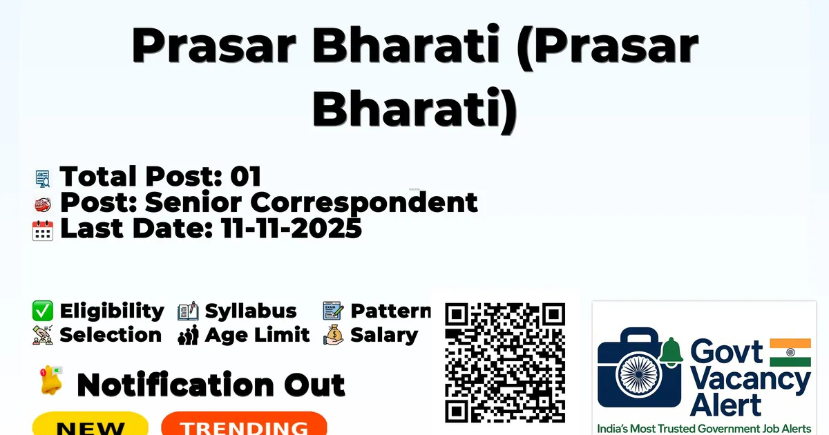 Prasar Bharati has released an official notification for the recruitment of 01 Senior Correspondent Posts. Interested and eligible candidates can apply Offline through the official Prasar Bharati website. The last date to submit the application form is 11-11-2025. In this article, you’ll find the Prasar Bharati Senior Correspondent Posts recruitment details, including eligibility criteria, age limit, salary structure, selection process, application steps, and direct links to the official notification and Offline application form.