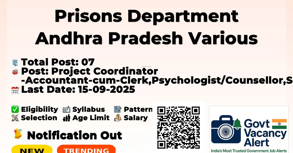 The Prisons Department Andhra Pradesh Recruitment 2025 for 07 posts of Project Coordinator, Nurse and More. Candidates with Any Graduate, B.Sc, 8TH Can Apply Offline. The Offline application opens on 30-08-2025, and closes on 15-09-2025. The candidate shall apply Offline through Prisons Department Andhra Pradesh website, visakhapatnam.ap.gov.in.