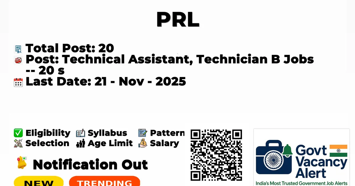 The Physical Research Laboratory (PRL) has officially released the notification to fill the vacancies of 20 Technical Assistant and Technician B Posts. Interested and eligibile candidates can use this opportunity to apply for these posts before the last date of application. Candidates who have completed their 10th pass, ITI, Diploma in Civil, Electrical, and Mechanical Engineering can apply for the PRL Recruitment 2025. The interested applicants can apply in online mode. Here we have mentioned the education details, age limit, selection process, application fee, salary, and how to apply for these posts before the deadline. The application dates have already begun.