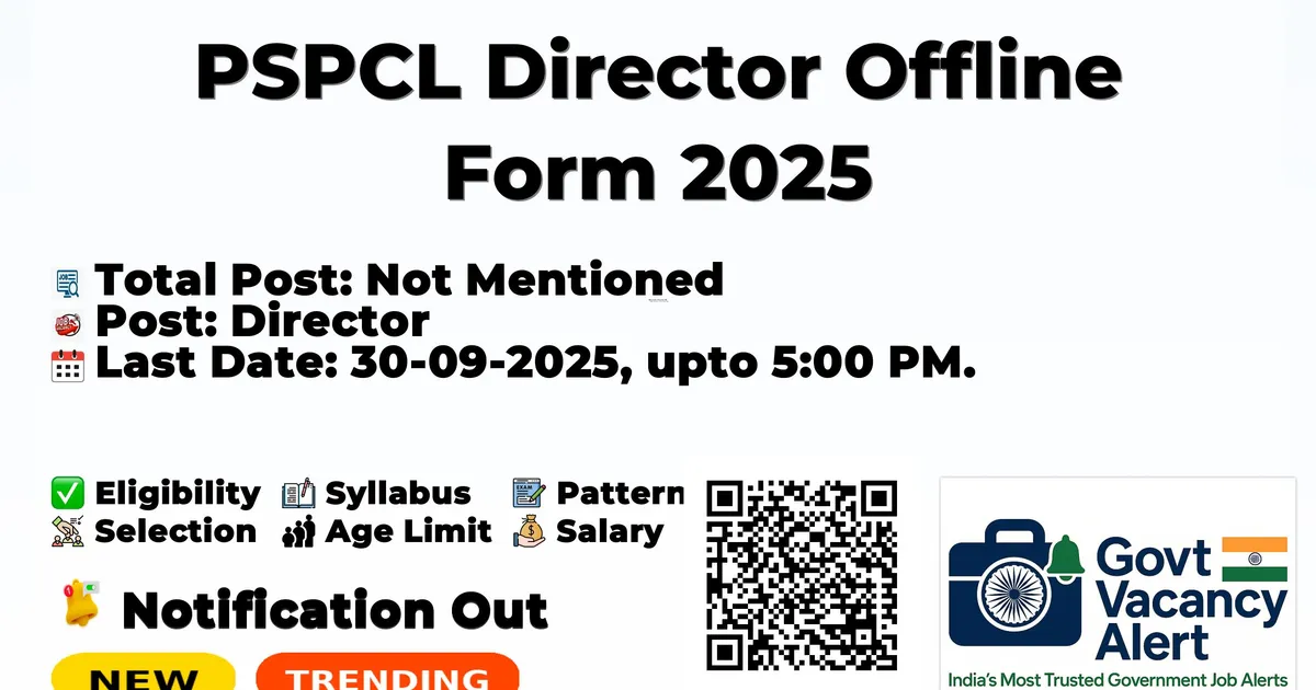 The Punjab State Power Corporation (PSPCL) Recruitment 2025 for posts of Director. Candidates with B.Tech/B.E Can Apply Offline. The Offline application closes on 30-09-2025. The candidate shall apply Offline through PSPCL website, pspcl.in.