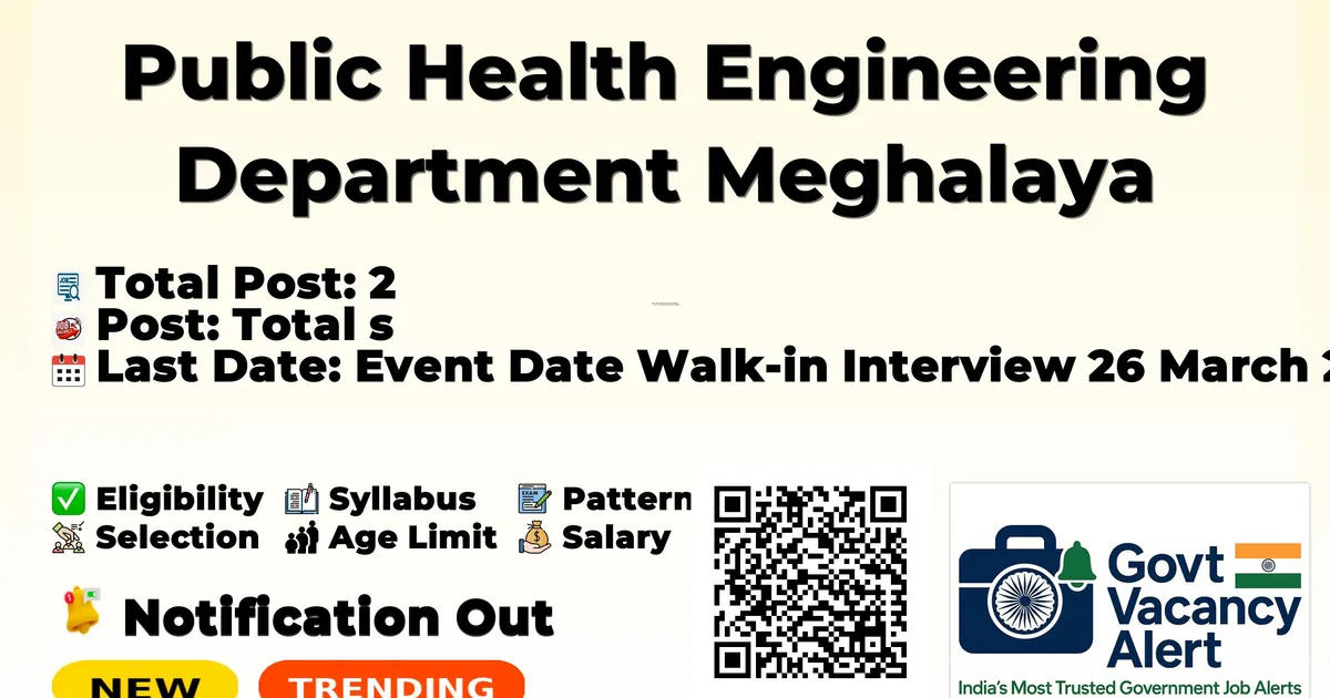 Public Health Engineering Department Meghalaya (PHE Ri Bhoi) has released an official notification for Walk-in Interview for 2 Project Manager (Technical) / Coordinator Capacity Building & Training Posts. Eligible candidates can attend the Walk-in Interview on 26-03-2026 at the PHE Ri Bhoi office with original documents and self-attested copies.