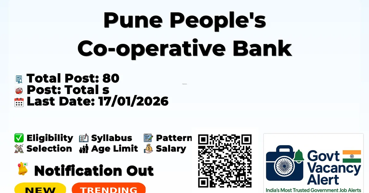 Pune People's Co-operative Bank has released an official notification for the recruitment of 80 Clerk Posts. Interested and eligible candidates can apply Online through the official Pune People's Co-operative Bank website. The last date to submit the application form is 17-01-2026. In this article, you’ll find the Pune People's Co-operative Bank Clerk Posts recruitment details, including eligibility criteria, age limit, salary structure, selection process, application steps, and direct links to the official notification and Online application form.