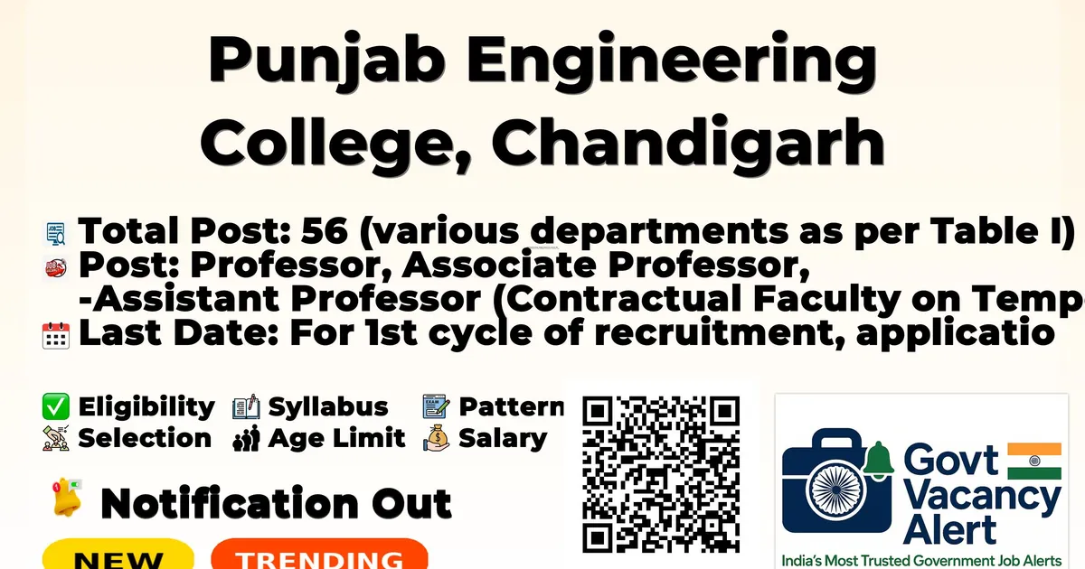 Company Name Punjab Engineering College, Chandigarh (Deemed to be University) (PEC) Post Name Professor, Associate Professor, Assistant Professor (Contractual Faculty on Temporary Basis for three years) No of Posts 56 (various departments as per Table I) Salary Professor: Rs. 1,44,200/- + DA per month; Associate Professor: Rs. 1,31,400/- + DA per month; Assistant Professor: Rs. 57,700/- + DA per month Qualification Minimum qualifications as per post: Ph.D. in the relevant field with first class or equivalent at Bachelor’s and Master’s level, with additional experience and research score for Associate Professor and Professor Age Limit Age limits are not specifically mentioned in the brochure Last Date for Apply For 1st cycle of recruitment, application closing date is 30th December, 2025 Official Website www.pec.ac.in