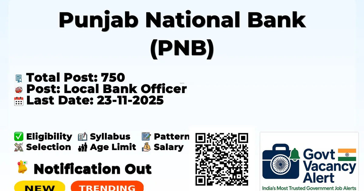 Company Name Punjab National Bank (PNB) Post Name Local Bank Officer No of Posts 750 Pay Matrix Rs. 48480-85920 Qualification Any Graduate Age Limit 20 to 30 years Start Date for Apply Online 03-11-2025 Last Date for Apply Online 23-11-2025 Official Website pnb.bank.in