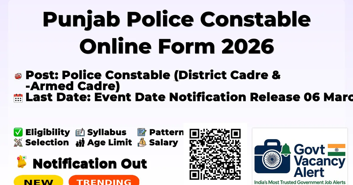 Punjab Police has announced the Punjab Police Recruitment 2026 for a total of 3298 vacancies for the post of Police Constable in District Cadre and Armed Cadre of Punjab Police. Interested candidates can check post-wise vacancy details, eligibility criteria, selection process, exam pattern and important dates such as notification release (06 March 2026), application start date (10 March 2026) and last date (30 March 2026) before submitting the online form through the official recruitment portal https://iur.ls/punjabpolicerecruitment2026. Advertisement Particulars Details Organisation Punjab Police Post Name(s) Police Constable (District Cadre & Armed Cadre) Total Vacancies 3298 District Cadre Vacancies 2522 (including 825 for women) Armed Cadre Vacancies 776 (including 259 for women) Recruitment Year 2026 Application Mode Online Notification Release Date 06 March 2026 Application Start Date 10 March 2026 (19:00 hrs) Application Last Date 30 March 2026 (23:55 hrs) Exam Date To be notified Official Website punjabpolice.gov.in Helpdesk Number 022-61306246 Event Date Notification Release 06 March 2026 Application Start Date 10 March 2026 (19:00 hrs) Application Last Date 30 March 2026 (23:55 hrs) Exam Date To be notified Category Total Vacancies Women Vacancies (out of total) General/Open/Unreserved 1066 304 Scheduled Castes Balmiki/Mazhbi Sikhs, Punjab 260 104 Scheduled Castes Ramdasia & Others, Punjab 260 104 Backward Classes, Punjab 260 104 Ex-Serviceman (General), Punjab 182 104 Ex-Serviceman SC Balmiki/Mazhbi Sikh, Punjab 52 00 Ex-Serviceman SC Ramdasia & Others, Punjab 52 00 Ex-Serviceman Backward Classes, Punjab 52 00 Wards of Police Personnel 52 18 Economically Weaker Sections, Punjab 260 78 Wards of Freedom Fighters, Punjab 26 09 Total District Cadre 2522 825 Category Total Vacancies Women Vacancies (out of total) General/Open/Unreserved 328 95 Scheduled Castes Balmiki/Mazhbi Sikhs, Punjab 80 32 Scheduled Castes Ramdasia & Others, Punjab 80 32 Backward Classes, Punjab 80 32 Ex-Serviceman (General), Punjab 56 32 Ex-Serviceman SC Balmiki/Mazhbi Sikh, Punjab 16 00 Ex-Serviceman SC Ramdasia & Others, Punjab 16 00 Ex-Serviceman Backward Classes, Punjab 16 00 Wards of Police Personnel 16 08 Economically Weaker Sections, Punjab 80 24 Wards of Freedom Fighters, Punjab 08 04 Total Armed Cadre 776 259 Note: The number of vacancies may be increased or decreased by Punjab Government/Punjab Police before completion of the recruitment process. Sports quota vacancies will be filled separately. Trending Govt Jobs RRB 22000 Group D Online form 2026 Indian Army Agniveer Recruitment Rally Notification 2026 AIIMS NORCET 10 Online Form 2026 HPCL 731 Engineers, JEA and More Online Form 2026 RBI 650 Assistant Online Form 2026 Candidates are advised to download and read the official Punjab Police Recruitment 2026 notification PDF (Advertisement No. 1 of 2026) before applying. The notification PDF contains detailed information on cadre-wise vacancy breakup, category-wise reservations (SC, BC, EWS, Ex-Servicemen, Wards of Police Personnel, Wards of Freedom Fighters), eligibility conditions, selection process, exam pattern and application instructions. Always verify all details, updates and corrigendum only from the official recruitment portal https://iur.ls/punjabpolicerecruitment2026 before submitting your application. Download Punjab Police Constable Recruitment 2026 Notification PDF Nationality The candidate should be a citizen of lndia, who has not obtained the citizenship/permanent residency/green card of any other country. Cadre Minimum Height (Male) Minimum Height (Female/Transgender) District & Armed Police 5 feet 7 inches (170.2 cm) 5 feet 2 inches (157.5 cm) Note: All Transgender candidates shall be treated at par with Female candidates in respect of Physical Screening Test and Physical Measurement Test. Candidates must have passed 10+2 or equivalent from a recognized Education Board/University on or before 01 January 2026. For Ex-Servicemen, the minimum educational qualification is Matriculation. Mandatory Punjabi qualification: All candidates must have passed Matriculation examination with Punjabi as one of the compulsory or elective subjects or any equivalent examination in Punjabi language on or before 01 January 2026. Minimum age: 18 years (as on 01 January 2026) Maximum age: 28 years (as on 01 January 2026) SC/BC candidates (Punjab residents): Upper age limit relaxed to 33 years Ex-Servicemen (Punjab residents): Actual service period in Armed Forces deducted from age, resultant age should not exceed maximum limit by more than 3 years Serving government employees: Upper age limit relaxed to 33 years Selected candidates for the post of Police Constable will receive a pay scale of Rs. 19,900/- per month as per Punjab Government Notification No. FD-FP-10MISC/87/2020-2FP1 dated 29.12.2020 and Punjab Police (First Amendment) Rules, 2025. Minimum pay of Rs. 19,900/- per month is admissible for three years from the date of joining, along with other admissible allowances such as DA, HRA and benefits as per government rules. Category Application Fee Examination Fee Total Fee General Rs. 550 Rs. 650 Rs. 1200 Ex-Servicemen (Punjab State only) Rs. 500 Rs. 0 Rs. 500 SC/ST (All States) & BC (Punjab only) Rs. 550 Rs. 150 Rs. 700 EWS Rs. 550 Rs. 150 Rs. 700 Note: Fee once paid will not be refunded. Payment mode: Online only (Debit/Credit Card, Net Banking, UPI). The Punjab Police Constable Recruitment 2026 selection process consists of three stages: The CBT comprises two papers: Section Topics Number of Questions General Awareness Constitution, Central & State Legislature, History, Geography, Culture & Economy of Punjab, Health & Nutrition, Current Affairs 35 Quantitative Aptitude and Numerical Skills Simplification, Average, Decimal & Fractions, Ratio & Proportion, Percentages, Profit & Loss, Simple Interest, Time & Work 20 Mental Ability & Logical Reasoning Number & Letter Series, Sequencing, Statements & C