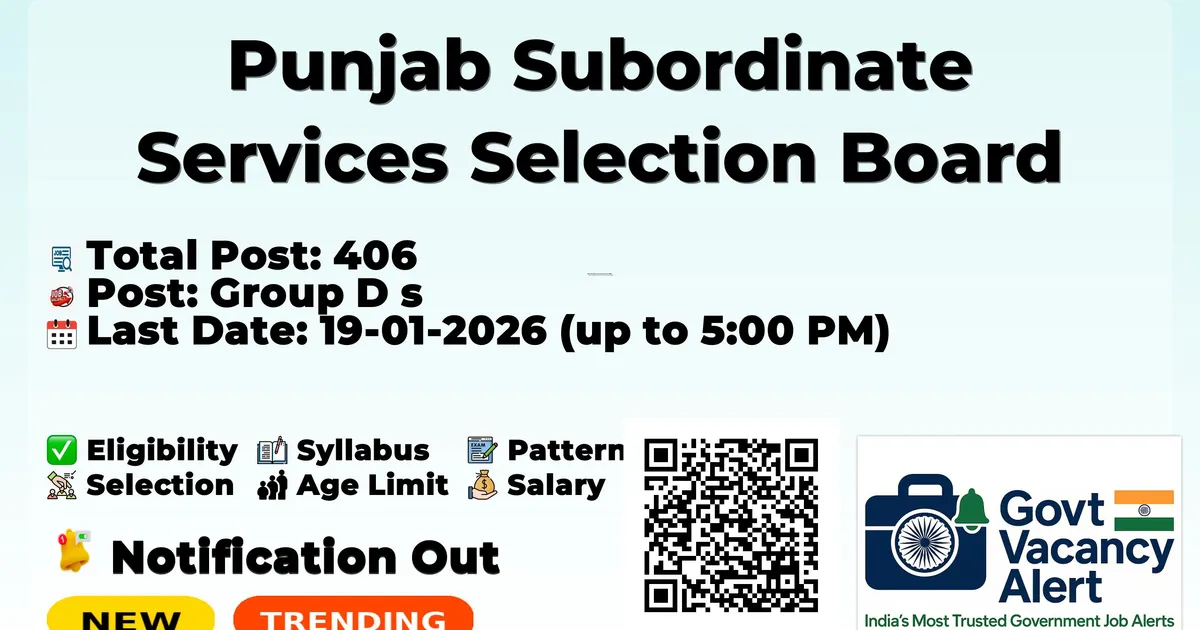 Company Name Punjab Subordinate Services Selection Board (PSSSB) Post Name Group D Posts No of Posts 406 Salary Rs. 18,000 – 56,900 (Level 1, 7th CPC) Qualification Matriculation with Punjabi as a subject Age Limit 18 to 37 years (as on 01-01-2025) Start Date for Apply 21-11-2025 Last Date for Apply 19-01-2026 (up to 5:00 PM) Official Website sssb.punjab.gov.in