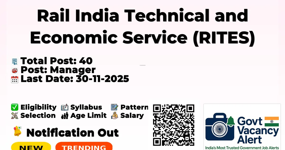 Rail India Technical and Economic Service (RITES) has released an official notification for the recruitment of 40 Manager Posts. Interested and eligible candidates can apply Online through the official RITES website. The last date to submit the application form is 30-11-2025. In this article, you’ll find the RITES Manager Posts recruitment details, including eligibility criteria, age limit, salary structure, selection process, application steps, and direct links to the official notification and Online application form.