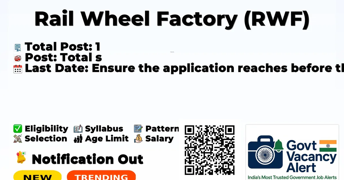 Rail Wheel Factory (RWF) has released an official notification for the recruitment of 1 Chief Transport Inspector Posts. Interested and eligible candidates can apply Offline by sending the application form to the official address. The last date to submit the application is 25-03-2026. In this article, you'll find the Chief Transport Inspector recruitment details, including eligibility criteria, age limit, salary structure, selection process, application procedure, and direct links to the official notification and application form download. Advertisement Company Name Rail Wheel Factory (RWF) Post Name Chief Transport Inspector (Ex-cadre) No of Posts 1 Salary Level-7 of RS (RP) Rules 2016 Qualification Group C volunteers from all depts working in Level-6 of RS (RP) Rules 2016 with minimum two years service. Last Date 25-03-2026 Apply Mode Offline Job Type Full Time Candidates who are interested in applying for the RWF Recruitment 2026 should first download and carefully read the official notification PDF. The notification contains complete details about vacancy distribution, eligibility criteria, age limit, stipend/salary, selection process, important dates, and application instructions. Reading the official document is important to ensure that you meet all requirements before submitting the application form. Download RWF Chief Transport Inspector Job 2026 Notification PDF Post Name Total Posts Chief Transport Inspector 1 Total 1 Group C volunteers from all departments working in Level-6 of RS (RP) Rules 2016 with a minimum of two years of service. Must be conversant with preventive/breakdown maintenance for Road Transport Vehicles. Ability to supervise a sizeable workforce of drivers for regulating transport arrangements. Conversant with the Motor Vehicle Act, 1989, and formalities in RTO's office. Ability to drive a Motor Cycle/Scooter as well as a Light Motor Vehicle and possess a valid Driving License. Category Fee General/OBC Nil SC/ST Nil Age relaxation will be as per government rules. Level-7 of RS (RP) Rules 2016 Event Date Notification Date 12 March 2026 Last Date for Receipt of Applications 25 March 2026 Computer Based Test (CBT) Candidates who wish to apply for RWF Chief Transport Inspector Recruitment 2026 through offline mode should follow the steps below. Read the official notification carefully before applying. Download the application form from the official website: . Fill the application form carefully with correct information. Attach self-attested copies of required documents such as photograph, signature, ID proof, and certificates. Check all details carefully before submission. Send the completed application form to the address mentioned in the notification through Speed Post / Registered Post or as instructed. Ensure the application reaches before the last date: 25-03-2026. Keep a photocopy of the submitted application form for future reference. Link Description Link Official Notification PDF Click here Official Website Click here