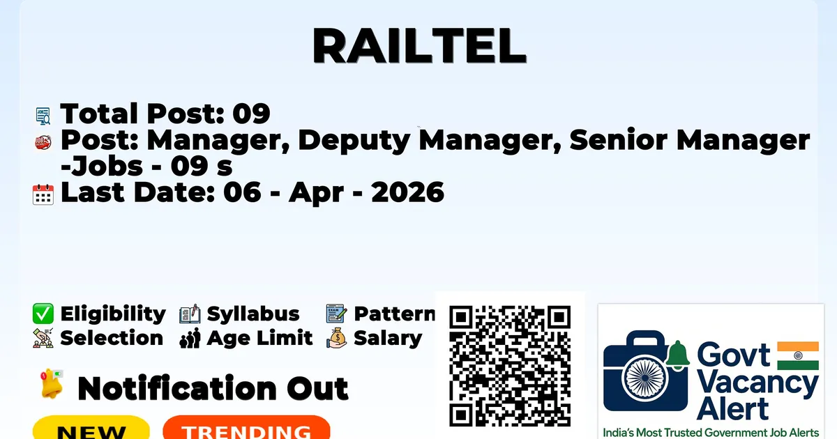The RailTel Corporation of India Limited (RailTel) has officially released the notification to fill the vacancies of 09 Manager, Deputy Manager, and Senior Manager Jobs. Interested and eligibile candidates can use this opportunity to apply for these posts before the last date of application. Candidates who have completed their B.E./B. Tech in Electronics, Computer Science Engineering, B.Sc., M.Sc., MCA can apply for the RailTel Notification 2026. The interested applicants can apply in offline mode. Here we have mentioned the education details, age limit, selection process, application fee, salary, and how to apply for these posts before the deadline. The application dates have already begun.