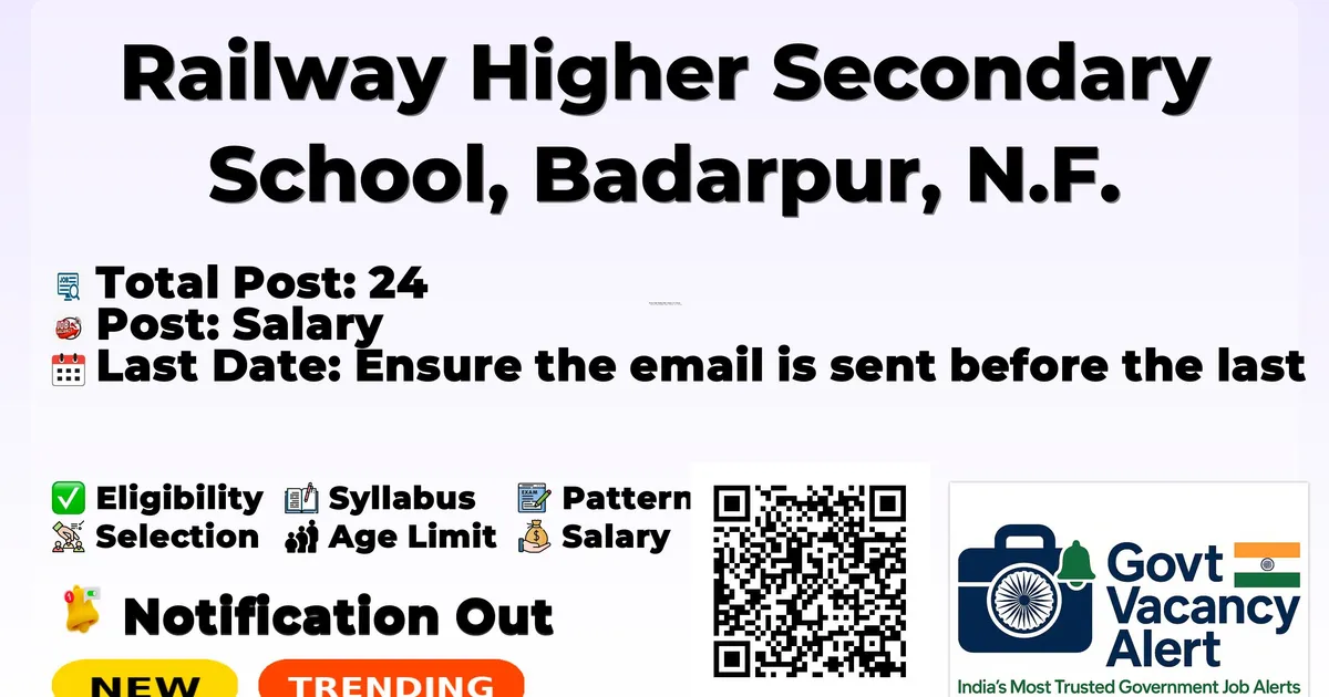 Railway Higher Secondary School, Badarpur, N.F. Railway (NFR RHSS Badarpur) Recruitment 2026: Railway Higher Secondary School, Badarpur, N.F. Railway has released the official notification for 24 Part Time Contractual Teachers (PGT/TGT/PRT) posts, inviting applications from eligible candidates. This recruitment provides an excellent opportunity for candidates seeking government jobs. Candidates can apply by sending their complete application along with required documents via email. The last date to submit the email application is 05-03-2026. Below, you can find complete details of Part Time Contractual Teachers (PGT/TGT/PRT) Recruitment 2026, including vacancy breakdown, eligibility, age limit, salary, selection process, application procedure, and important links. Advertisement Company Name Railway Higher Secondary School, Badarpur, N.F. Railway Post Name Part Time Contractual Teachers (PGT/TGT/PRT) No of Posts 24 Advt No E/252/RHSS/BPB/Contractual Pt-III/2026 Salary Rs. 21,250/- to Rs. 27,500/- Per Month Qualification B.Ed or equivalent, Post Graduation Degree with 50% marks, Bachelor's Degree with 50% marks, CTET/TET qualified (preferred) Age Limit Min: 18 years, Max: 65 years Last Date 05-03-2026 Walk-in Date 19-03-2026 & 20-03-2026 Apply Mode Email Job Type Part Time Trending Govt Jobs PNB Bank 5138 Apprentices Online Form 2026 RRB 22000 Group D Online form 2026 MCL 677 Various Vacancies Online Form 2026 DSSSB 911 AE, JE & More Online Form 2026 Indian Navy 260 SSC Officer Online Form 2026 Candidates should download and read the NFR RHSS Badarpur Jobs 2026 notification PDF carefully to check vacancy details, eligibility, age limit, and application instructions. The notification also includes important dates and selection process details. The direct download link is available in the Important Links section below. Download NFR RHSS Badarpur Job 2026 Notification PDF Post Name Total Posts Post Graduate Teacher 05 Trained Graduate Teacher 13 Primary Teacher 06 Total 24 Post Graduate Teacher: Two-Years Integrated Post Graduate Master's Degree Course of Regional Institute of Education of NCERT or Post-Graduation Degree with 50% marks in the concerned subject with B. Ed or equivalent degree. Proficiency in teaching in Hindi and English media is required. Trained Graduate Teacher: Four/Five-Years Integrated Degree Course of Regional College of Education or Bachelor's Degree with at least 50% marks in aggregate in the concerned subject with B. Ed or equivalent degree. Preference will be given to CTET qualified candidates. Primary Teacher: Senior Secondary with at least 50% marks and 2-year Diploma in Elementary Education (D.El.Ed.) OR Graduation with at least 50% marks and D.El.Ed. Preference will be given to CTET/TET qualified candidates. Category Fee General/OBC Nil SC/ST Nil Minimum Age: 18 years Maximum Age: 65 years Post Name Salary Post Graduate Teacher Rs. 21,250/- to Rs. 27,500/- Per Month Trained Graduate Teacher Rs. 21,250/- to Rs. 27,500/- Per Month Primary Teacher Rs. 21,250/- to Rs. 27,500/- Per Month Event Date Notification Date 11 February 2026 Application Starting Date 11 February 2026 Application Closing Date 05 March 2026 PGT Interview Date 19 March 2026 TGT and PRT Interview Date 20 March 2026 Walk-in Interview Document Verification Candidates who wish to apply for NFR RHSS Badarpur Various Posts Recruitment 2026 via email should follow the steps below. Read the official notification carefully before applying. Prepare your application with complete bio-data including personal details, educational qualifications, and experience. Attach self-attested copies of all required documents such as educational certificates, experience certificates, ID proof, and recent passport-size photographs. Clearly mention the post applied for in the subject line of the email. Send the complete application to the official email address mentioned in the notification. Ensure the email is sent before the last date: 05-03-2026. Keep a copy of the sent email for future reference. Link Description Link Official Notification PDF Click here Official Website Click here