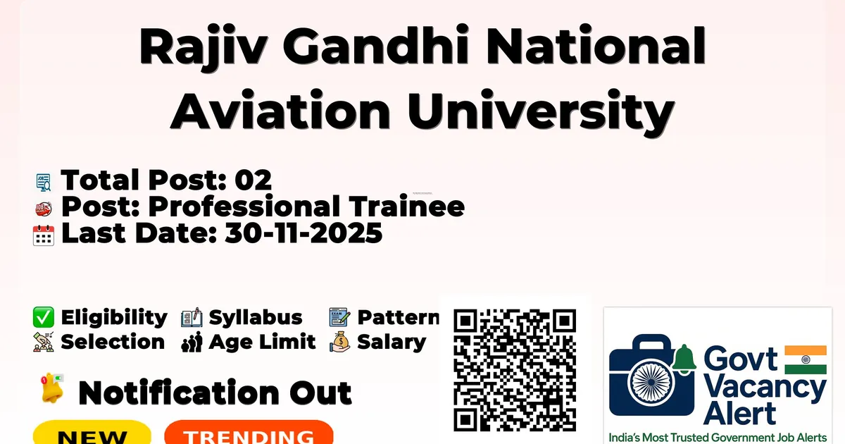 Rajiv Gandhi National Aviation University (RGNAU) has released an official notification for the recruitment of 02 Professional Trainee Posts. Interested and eligible candidates can apply Online through the official RGNAU website. The last date to submit the application form is 30-11-2025. In this article, you’ll find the RGNAU Professional Trainee Posts recruitment details, including eligibility criteria, age limit, salary structure, selection process, application steps, and direct links to the official notification and Online application form.