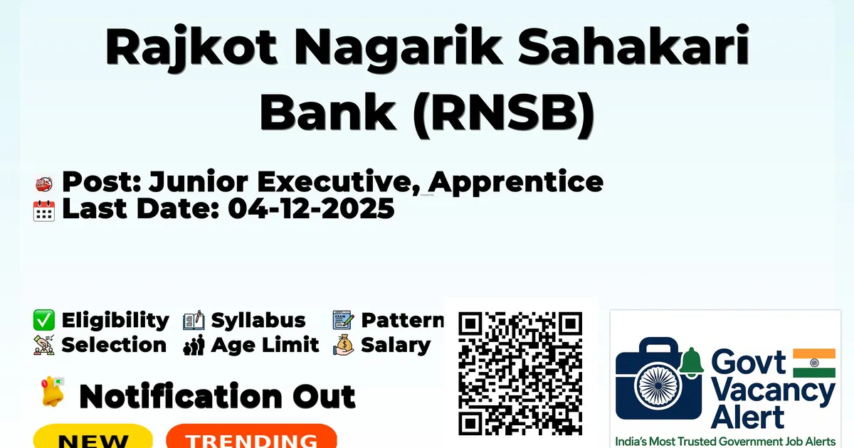 Rajkot Nagarik Sahakari Bank (RNSB) has released an official notification for the recruitment of Not Mentioned Junior Executive, Apprentice Posts. Interested and eligible candidates can apply Online through the official RNSB website. The last date to submit the application form is 04-12-2025. In this article, you’ll find the RNSB Junior Executive, Apprentice Posts recruitment details, including eligibility criteria, age limit, salary structure, selection process, application steps, and direct links to the official notification and Online application form. Join Arattai Channel Trending Govt Jobs RRB NTPC 5,810 Online Form 2025 RRB 2569 JE (Junior Engineer) Online Form 2025 Intelligence Bureau (IB) 362 MTS Online Form 2025 OICL 300 AO Online Form 2025 UP 41424 Home Guard Online Form 2025 Advertisement Company Name Rajkot Nagarik Sahakari Bank (RNSB) Post Name Junior Executive, Apprentice Qualification Any Graduate, Any Post Graduate Age Limit 30 years Start Date for Apply Online 27-11-2025 Last Date for Apply Online 04-12-2025 Official Website rnsb.bank.in Junior Executive: First Class Graduate (Except Arts) OR Postgraduate (Except Arts).2 year course. Apprentice: Any Graduate Maximum Age limit: 30 Years Age relaxation is applicable as per rules. Starting Date for Apply Online: 27-11-2025 Last Date for Apply Online: 04-12-2025 Apply Online: Click here Official Notification PDF: Click here Official Website: Click here Join Arattai Channel: Click Here Join Telegram Channel: Click Here Join WhatsApp Channel: Click Here Sarkari Result: Click Here Download Mobile App: Click Here Jobs In Gujarat Ahmedabad Amreli Anand Ankleshwar Aravalli Banaskantha Baroda Bharuch Bhavnagar Bhuj Dohad Gandhidham Gandhinagar Gir Jamnagar Junagadh Junagarh Kachchh Kandla Mehsana Morbi Narmada Navsari PanchMahal Patan Porbandar Rajkot Sabarkantha Surat Surendranagar Tapi The Dangs Vadodara Valsad-Vapi Veraval Also Read SEBI Recruitment 2025 - Officer Grade A (Assistant Manager) Vacancies - Rs 62500 to 126100 Salary - Apply Now AIIMS CRE Recruitment 2025 - 1300+ Group B and Group C Posts - Apply Link Click Here RRB Recruitment 2025 - 2500+ JE (Junior Engineer) Vacancies - 35400 Monthly Salary - Apply Now Jobs By Education 10TH Jobs› 8TH Jobs› 12TH Jobs› Diploma Jobs› ITI Jobs› B.Tech/B.E Jobs› B.com Jobs› Any Graduate Jobs› Any Post Graduate Jobs› Rajasthan Police Constable PET/PST Admit Card 2025 RRB Group D Admit Card 2025 CSBC Bihar Police Constable PET Admit Card 2025 RRB NTPC 5,810 Online Form 2025 RRB 2569 JE (Junior Engineer) Online Form 2025 Intelligence Bureau (IB) 362 MTS Online Form 2025 BSSC 23175 Inter Level Online Form 2025 Bihar STET Answer Key 2025 UP 41424 Home Guard Online Form 2025 1. What is the starting date to apply online for RNSB Junior Executive, Apprentice 2025? Ans: Starting Date to apply online is 27-11-2025. 2. What is the last online apply date for RNSB Junior Executive, Apprentice 2025? Ans: Last online apply date is 04-12-2025. 3. What is the Eligibility to apply for RNSB Junior Executive, Apprentice 2025? Ans: Any Graduate, Any Post Graduate 4. What is the Maximum Age Limit to apply for RNSB Junior Executive, Apprentice 2025? Ans: 30 Years