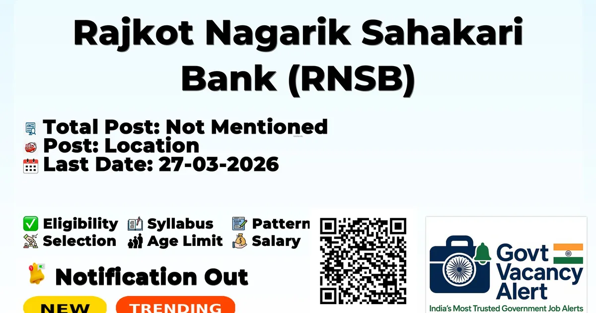 Rajkot Nagarik Sahakari Bank (RNSB) has released an official notification for the recruitment of Jr.Executive, Office Assistant Posts. Interested and eligible candidates can apply Online through the official RNSB website. The last date to submit the application form is 27-03-2026. In this article, you’ll find the RNSB Jr.Executive, Office Assistant Posts recruitment details, including eligibility criteria, age limit, salary structure, selection process, application steps, and direct links to the official notification and Online application form. FreeJobAlert - Your Personal Govt Job Finder 10M+Users 100+Jobs/day FreeAlways ⚡ Get Custom Govt Job Alerts - Alerts by Qualification, State and Interest. Set Free Alerts ● Free · No spam · Unsubscribe anytime · freejobalert.com Advertisement Company Name Rajkot Nagarik Sahakari Bank (RNSB) Post Name Jr.Executive, Office Assistant No of Posts Not Mentioned Qualification Any Graduate, Any Post Graduate Start Date for Apply Online 20-03-2026 Last Date for Apply Online 27-03-2026 Official Website https://rnsb.bank.in/ Candidates should download and read the RNSB Jobs 2026 notification PDF carefully to check vacancy details, eligibility, age limit, and application instructions. The notification also includes important dates and selection process details. The direct download link is available in the Important Links section below. Download RNSB Job 2026 Notification PDF Post Name Location Number of Posts Jr.Executive (Trainee) Nagpur - Office Assistant (Trainee) Nagpur - Jr.Executive (Trainee) Qualification: First Class Graduate (Except Arts) OR Postgraduate (Except Arts).2 year course. Experience: 2 years’ experience in any Co-Operative bank or any financial institute is preferable. Candidate Should be well versed with Computer knowledge (Freshers may apply) Office Assistant (Trainee) Qualification: Any Graduate Experience: Candidate should know English, Hindi, Local Language with writing and speaking. (freshers may apply) Maximum Age limit: 30 Years Age relaxation is applicable as per rules. Starting Date for Apply Online: 20-03-2026 Last Date for Apply Online: 27-03-2026 Apply Online: Click here Official Notification PDF: Click here Official Website: Click here Join Arattai Channel: Click Here Join Telegram Channel: Click Here Join WhatsApp Channel: Click Here Sarkari Result: Click Here Download Mobile App: Click Here