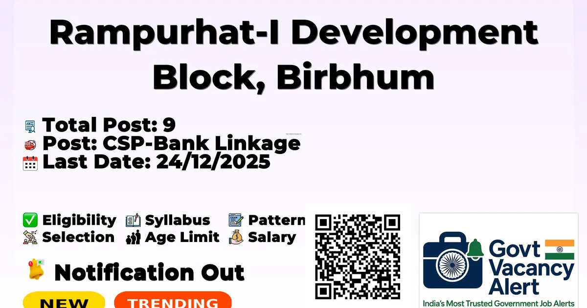 Company Name Rampurhat-I Development Block, Birbhum (Rampurhat-I Block) Post Name CSP-Bank Linkage No of Posts 9 Qualification Higher Secondary Passed / Equivalent Age Limit 21 to 40 years Start Date for Apply 10/12/2025 Last Date for Apply 24/12/2025 Official Website birbhum.gov.in