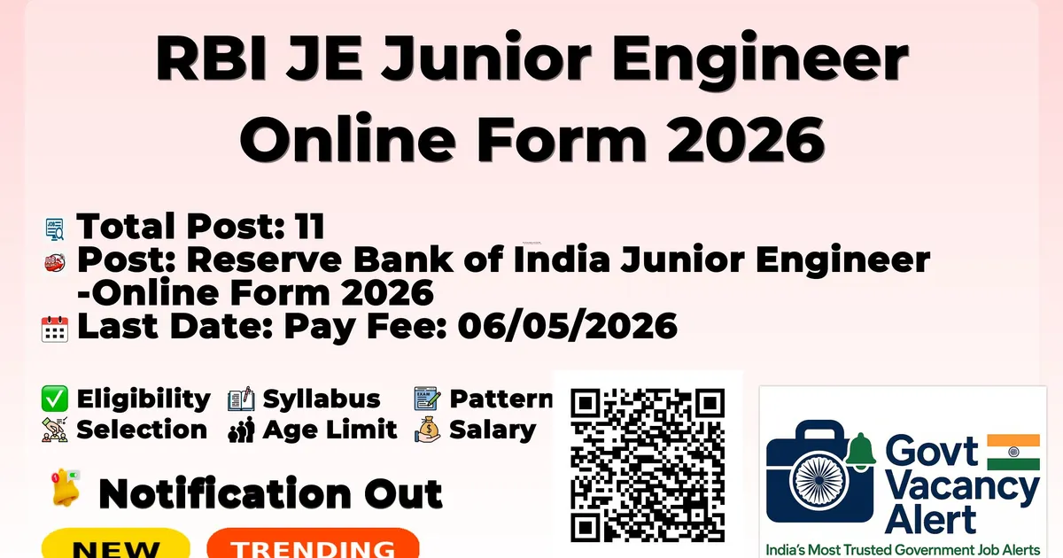 Reserve Bank JE Recruitment 2026: Reserve Bank of India (RBI) are invited to apply online application form for RBI Junior Engineer JE Civil / Electrical Recruitment 2026. Other information related to this recruitment like selection procedure, pay scale, age limit, syllabus information is available in the notification (RBI JE Junior Engineer Online Form 2026).