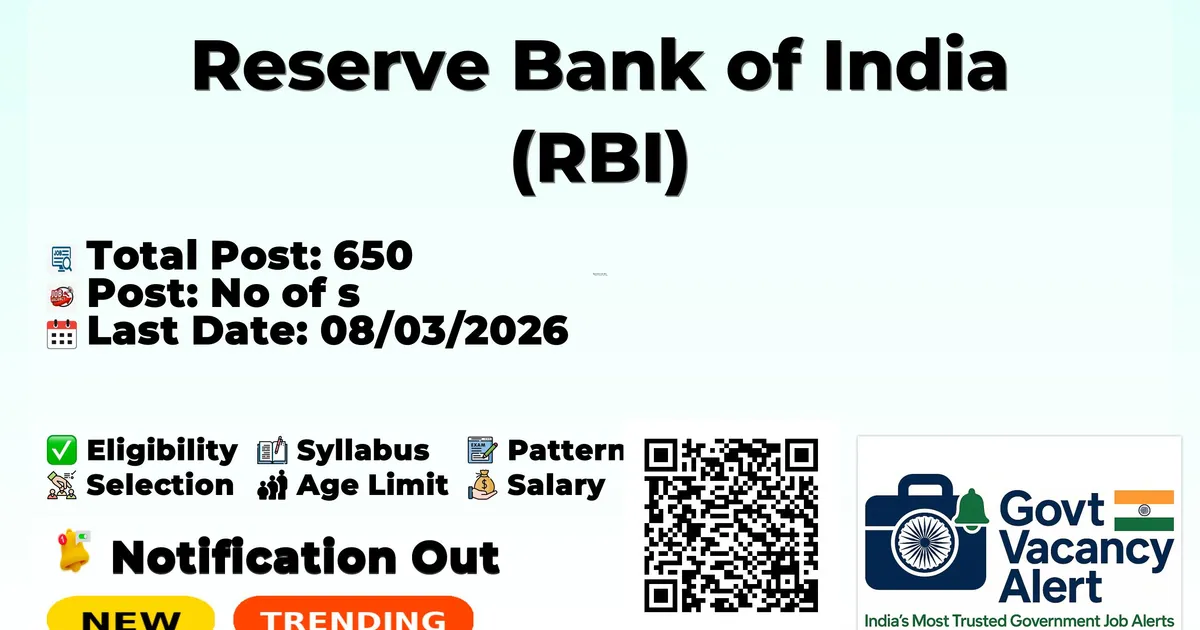 Company Name Reserve Bank of India (RBI) Post Name Assistant No of Posts 650 Advt No N/A Salary N/A Qualification As per detailed advertisement on official website Age Limit As per detailed advertisement on official website Start Date for Apply 16/02/2026 Last Date for Apply 08/03/2026 Official Website www.rbi.org.in