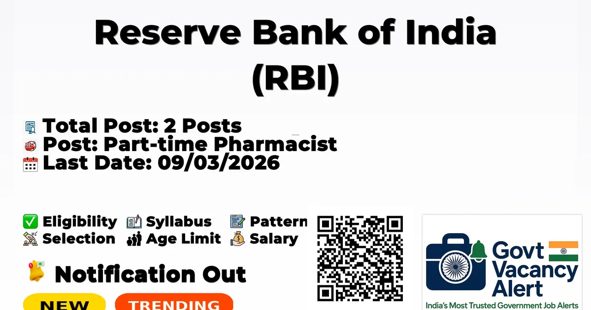 Reserve Bank of India (RBI) has released an official notification for the recruitment of 02 Part Time Pharmacist Posts. Interested and eligible candidates can apply Offline through the official RBI website. The last date to submit the application form is 09-03-2026. In this article, you’ll find the RBI Part Time Pharmacist Posts recruitment details, including eligibility criteria, age limit, salary structure, selection process, application steps, and direct links to the official notification and Offline application form.