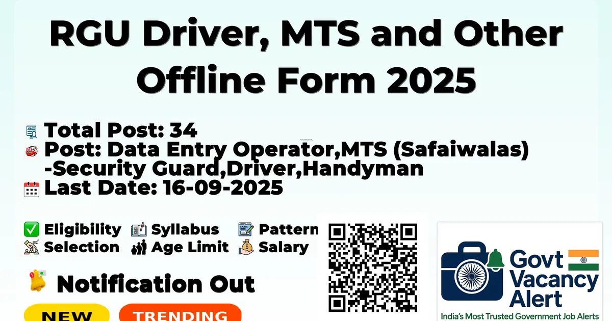 The Rajiv Gandhi University (RGU) Recruitment 2025 for 34 posts of Driver, MTS and Other. Candidates with Any Graduate, 10TH Can Apply Offline. The Offline application opens on 05-09-2025, and closes on 16-09-2025. The candidate shall apply Offline through RGU website, rgu.ac.in. The RGU Driver, MTS and Other Recruitment 2025 Notification PDF has been released on 05-09-2025 at rgu.ac.in. Check the complete job details, vacancy, age limit, application fee, selection process and how to apply from the article. You can Check all Latest Sarkari Result Updates of All Central Government Jobs and State Government Jobs. RGU Driver, MTS and Other Recruitment 2025 Notification PDF