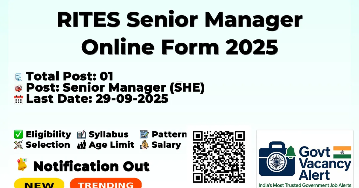 The Rail India Technical and Economic Service (RITES) Recruitment 2025 for 01 posts of Senior Manager. Candidates with B.Tech/B.E Can Apply Online. The online application opens on 12-09-2025, and closes on 29-09-2025. The candidate shall apply online through RITES website, rites.com. The RITES Senior Manager Recruitment 2025 Notification PDF has been released on 13-09-2025 at rites.com. Check the complete job details, vacancy, age limit, application fee, selection process and how to apply from the article. You can Check all Latest Sarkari Result Updates of All Central Government Jobs and State Government Jobs. RITES Senior Manager Recruitment 2025 Notification PDF