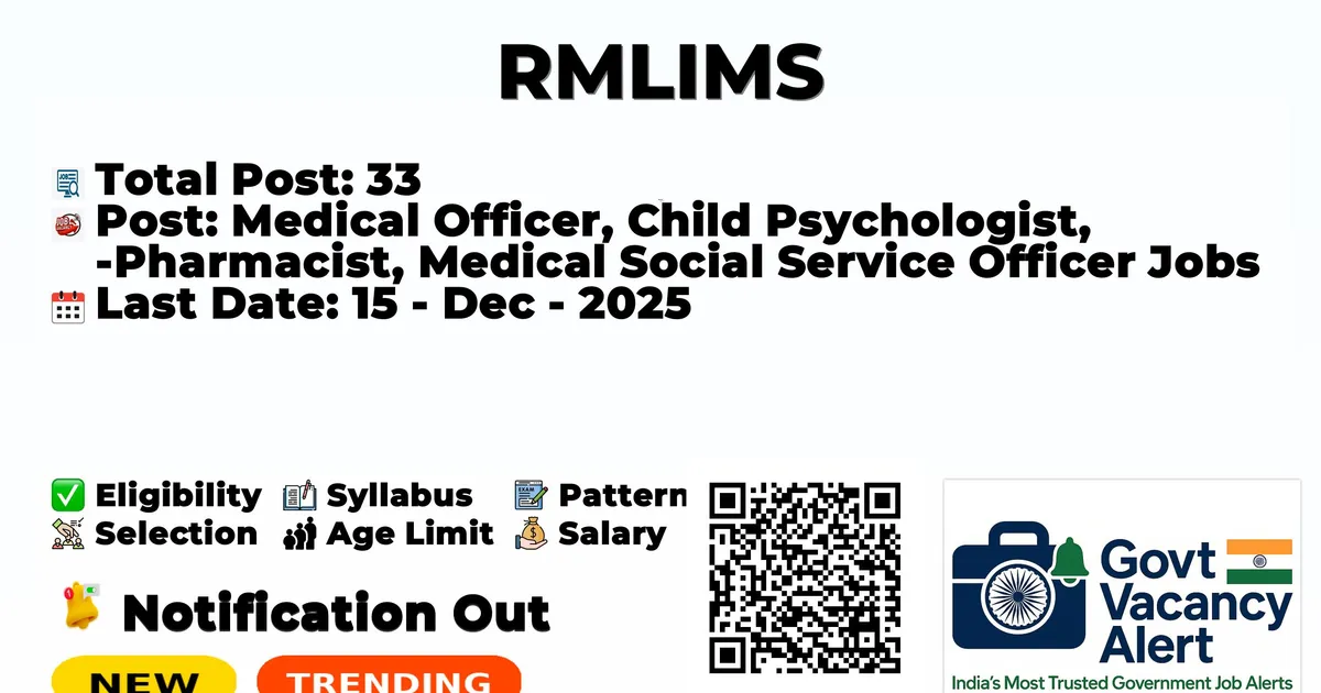 RMLIMS — Medical Officer, Child Psychologist, Pharmacist, Medical Social Service Officer Jobs - 33 Posts