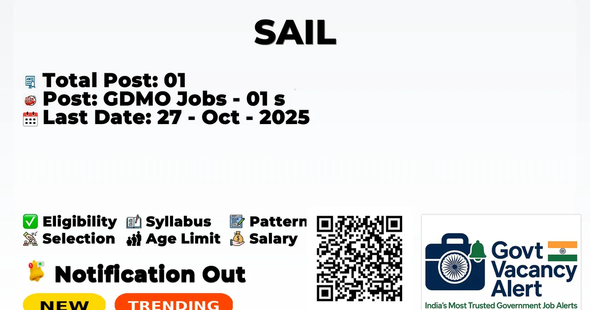Steel Authority of India (SAIL) has declared the official notification for 2025. To fill up the vacancies for GDMO Jobs. Those candidates who have qualified in the MBBS can grab this chance and apply for the SAIL Recruitment 2025. Here, we include the age limit, selection process, salary structure, education details, application fee, and how to apply for these posts. Interested and eligible candidates can attend the walk-in at the address given below.