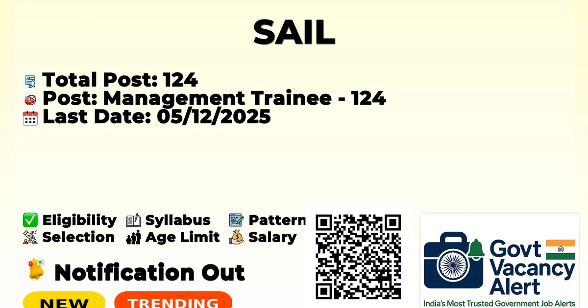 Steel Authority of India Limited (SAIL) is looking for young, energetic, result oriented and promising talent to join as Management Trainee (Technical) in E-1 Grade in various engineering disciplines for operation of SAIL Plants / Units and Mines across India. The SAIL Management Trainee 2025-26 Online Registration start from 15th November and scheduled to be end on 5th December 2025. Interested and eligible candidates must carefully read the detailed SAIL notification before filling out the application form. www.indgovtjobs.in Job Title Management Trainee (Technical) (MTT) Total Vacancies 124 Age Limit Maximum 28 years Monthly Salary ₹ 50,000/- (training); ₹ 60,000 - 1,80,000/- (post-training) Minimum Qualification B.E. with 65% in relevant discipline Selection Process Online Exam, GD, Interview Job Location Across India (SAIL Plants/Units/Mines) Last Date 05/12/2025 Engineering Discipline No of Posts Chemical - Civil - Computer - Electrical - Electronics - Instrumentation - Mechanical - Metallurgy - General - 28 years OBC (NCL) - 31 years SC / ST - 33 years PwBD - Additional 10 years Relaxation Departmental Candidates - 45 years