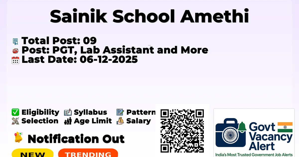 Company Name Sainik School Amethi Post Name PGT, Lab Assistant and More No of Posts 09 Salary Available Soon Qualification Available Soon Age Limit Available Soon Last Date for Apply 06-12-2025 Official Website sainikschoolamethi.com