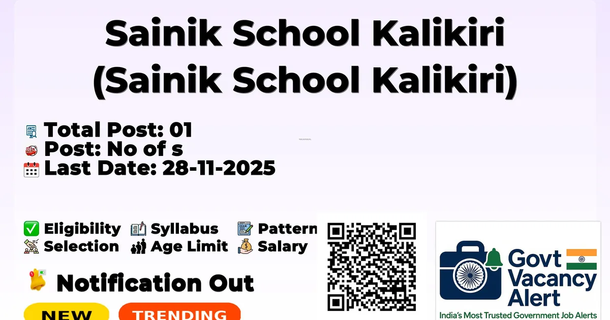 Sainik School Kalikiri has released an official notification for the recruitment of 01 TGT Posts. Interested and eligible candidates can apply Offline through the official Sainik School Kalikiri website. The last date to submit the application form is 28-11-2025. In this article, you’ll find the Sainik School Kalikiri TGT Posts recruitment details, including eligibility criteria, age limit, salary structure, selection process, application steps, and direct links to the official notification and Offline application form.