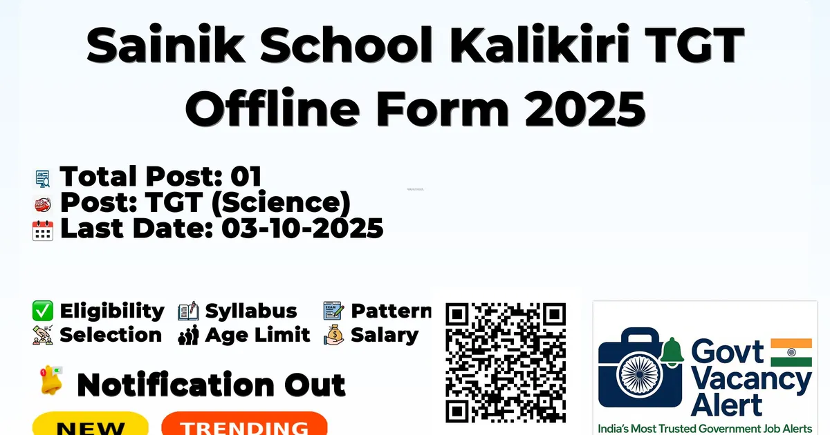The Sainik School Kalikiri Recruitment 2025 for 01 posts of TGT. Candidates Can Apply Offline. The Offline application opens on 13-09-2025, and closes on 03-10-2025. The candidate shall apply Offline through Sainik School Kalikiri website, sskal.ac.in.