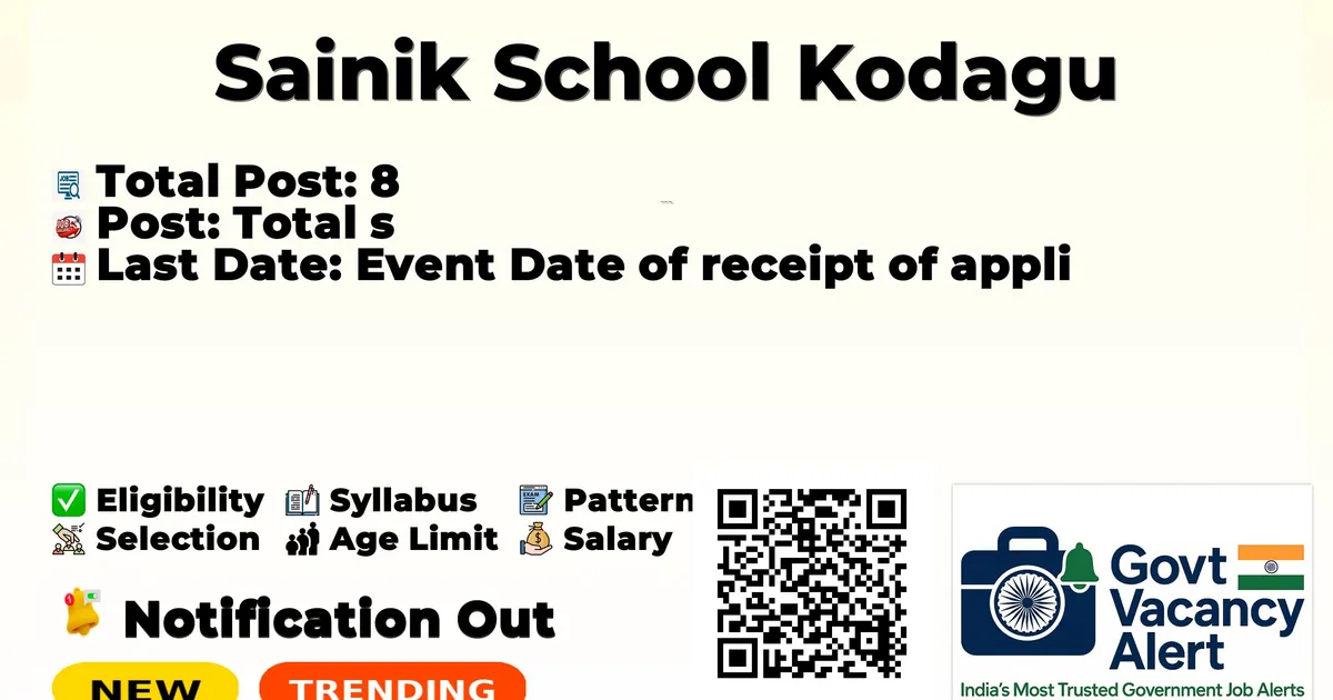 Sainik School Kodagu has officially released a notification for the recruitment of 8 PGT/TGT and Other Contractual Posts. This recruitment drive offers a great opportunity for candidates looking for government jobs. Interested and eligible candidates can download the application form from the official website and submit it offline. The offline application process is open until 27-03-2026, and candidates are advised to send their completed applications well before the deadline. In this article, you will find complete details about PGT/TGT and Other Contractual Recruitment 2026, including vacancy details, eligibility criteria, age limit, salary, selection process, application steps, and important links. Advertisement Company Name Sainik School Kodagu Post Name PGT/TGT and Other Posts No of Posts 8 Advt No 02/FEB 2026 Salary Rs. 55,000/- - Rs. 79,650/- Per Month Qualification Post Graduation with 50% marks, B.Ed., CTET/TET qualified, MBBS, PG Psychology, Bachelor’s in Music Age Limit Min: 21 years, Max: 50 years Last Date 27 March 2026 Apply Mode Offline Job Type Contractual Candidates who are interested in applying for the Sainik School Kodagu Recruitment 2026 should first download and carefully read the official notification PDF. The notification contains complete details about vacancy distribution, eligibility criteria, age limit, stipend/salary, selection process, important dates, and application instructions. Reading the official document is important to ensure that you meet all requirements before submitting the application form. Download Sainik School Kodagu Job 2026 Notification PDF Post Name Total Posts PGT (Chemistry) 1 PGT (Physics) 1 TGT (English) 1 TGT (Hindi) 1 TGT (Social Science) 1 Counsellor 1 Music Teacher 1 School Medical Officer 1 Total 8 Trending Govt Jobs IDBI Bank Junior Assistant Manager Online Form 2026 RRC Western Railway 5349 Apprentice Online Form 2026 Indian Navy Agniveer (MR) Online Form 2026 UPSC 1358 CMS Online Form 2026 Indian Navy Agniveer (SSR) Online Form 2026 PGT (Chemistry): Post Graduate in Chemistry with at least 50% marks (or equivalent) and B.Ed. from NCTE recognized institution or integrated Post Graduate B.Sc.Ed. PGT (Physics): Post Graduate in Physics with at least 50% marks (or equivalent) and B.Ed. from NCTE recognized institution or integrated Post Graduate B.Sc.Ed. TGT (English): Graduation/Post Graduation with 50% marks (or equivalent) in relevant subject and B.Ed. from NCTE recognized institution or 4-year B.A.Ed., CTET/TET qualified. TGT (Hindi): Graduation/Post Graduation with 50% marks (or equivalent) in relevant subject and B.Ed. from NCTE recognized institution or 4-year B.A.Ed., CTET/TET qualified. TGT (Social Science): Graduation/Post Graduation with 50% marks (or equivalent) in relevant subject and B.Ed. from NCTE recognized institution or 4-year B.A.Ed., CTET/TET qualified. Counsellor: Post Graduate in Psychology/Child Development/Diploma in Career Guidance + counselling experience. Music Teacher: Graduate + Bachelor’s Degree in Music. School Medical Officer: MBBS (MD in General Medicine/Pediatrics desirable + experience). Category Fee General/OBC Rs. 500/- SC/ST Rs. 350/- Minimum Age: 21 years Maximum Age: 50 years Age relaxation will be as per government rules. PGT (Chemistry): Rs. 65,000/- Per Month PGT (Physics): Rs. 65,000/- Per Month TGT (English): Rs. 55,000/- Per Month TGT (Hindi): Rs. 55,000/- Per Month TGT (Social Science): Rs. 55,000/- Per Month Counsellor: Rs. 55,000/- Per Month Music Teacher: Rs. 55,000/- Per Month School Medical Officer: Rs. 79,650/- Per Month Event Date Last date of receipt of applications 27 March 2026 Shortlisting based on essential qualifications Written Exam Skill test/Demonstration/Practical test (as applicable) Interview Read the official notification carefully before applying. Download the application form from the official website: www.sainikschoolkodagu.edu.in. Fill the application form carefully with correct information. Attach self-attested copies of required documents such as photograph, signature, ID proof, and certificates. Check all details carefully before submission. Send the completed application form to the address mentioned in the notification through Speed Post / Registered Post or as instructed. Ensure the application reaches before the last date: 27-03-2026. Keep a photocopy of the submitted application form for future reference. Link Description Link Official Notification PDF Click here Apply Offline Click here Official Website Click here