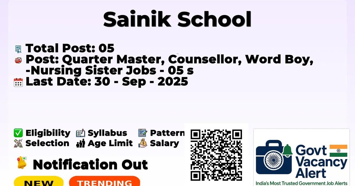 The Sainik School has declared the latest job notification for 2025. To fill up the vacancies for 05 Quarter Master, Counsellor, Word Boy, Nursing Sister Jobs. Those candidates who have qualified in Any Degree, Diploma, or 10th Pass can grab this chance and apply for the Sainik School Satara Recruitment 2025. Here we include the age limit, salary structure, and education details, application fee, and how to apply for these posts. Interested and eligible candidates can apply on or before the last date of application.