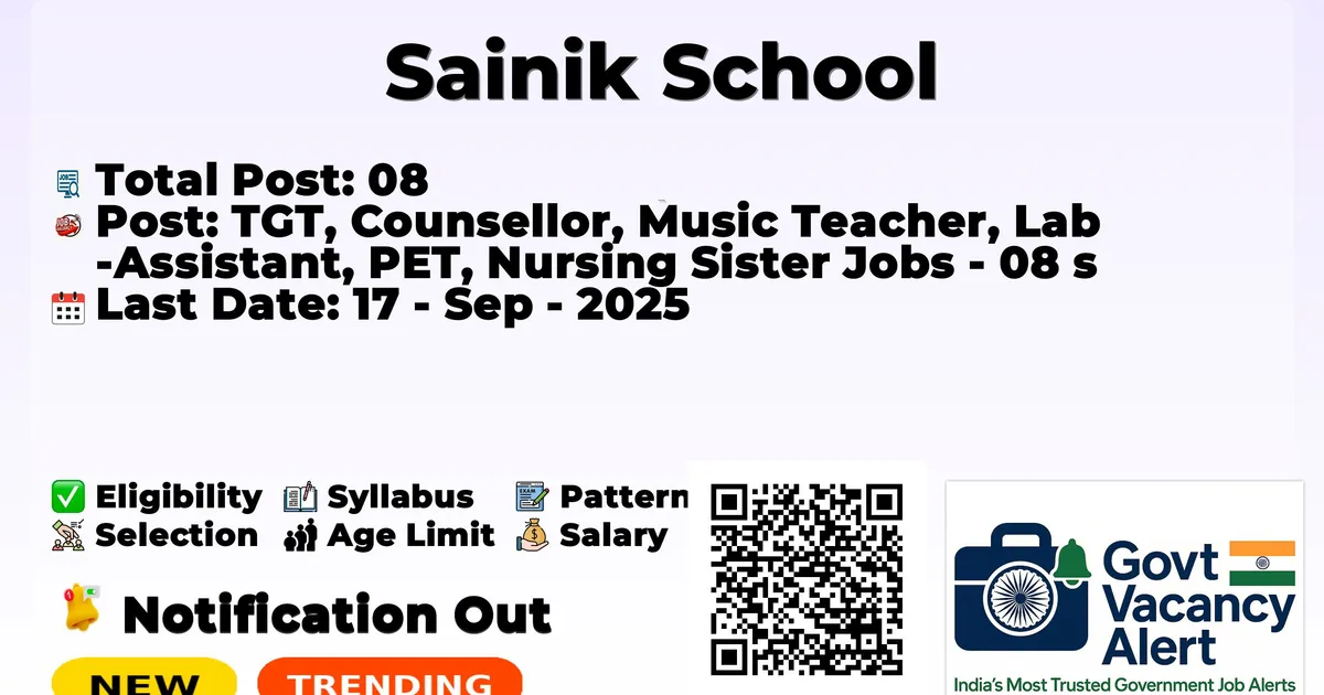 Sainik School — TGT, Counsellor, Music Teacher, Lab Assistant, PET, Nursing Sister Jobs - 08 Posts