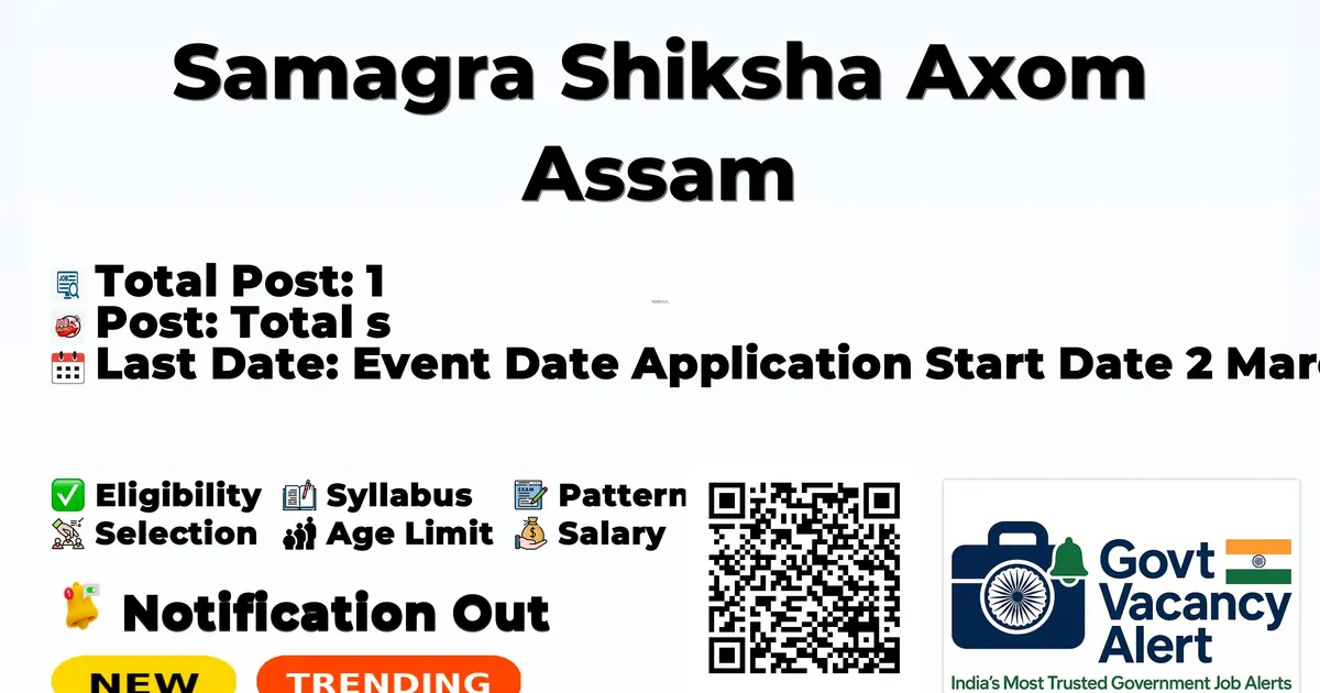 Samagra Shiksha Axom Assam (SSA Assam) has officially released a notification for the recruitment of 1 Quality Expert Posts. This recruitment drive offers a great opportunity for candidates looking for education jobs. Interested and eligible candidates can apply online through the official website.