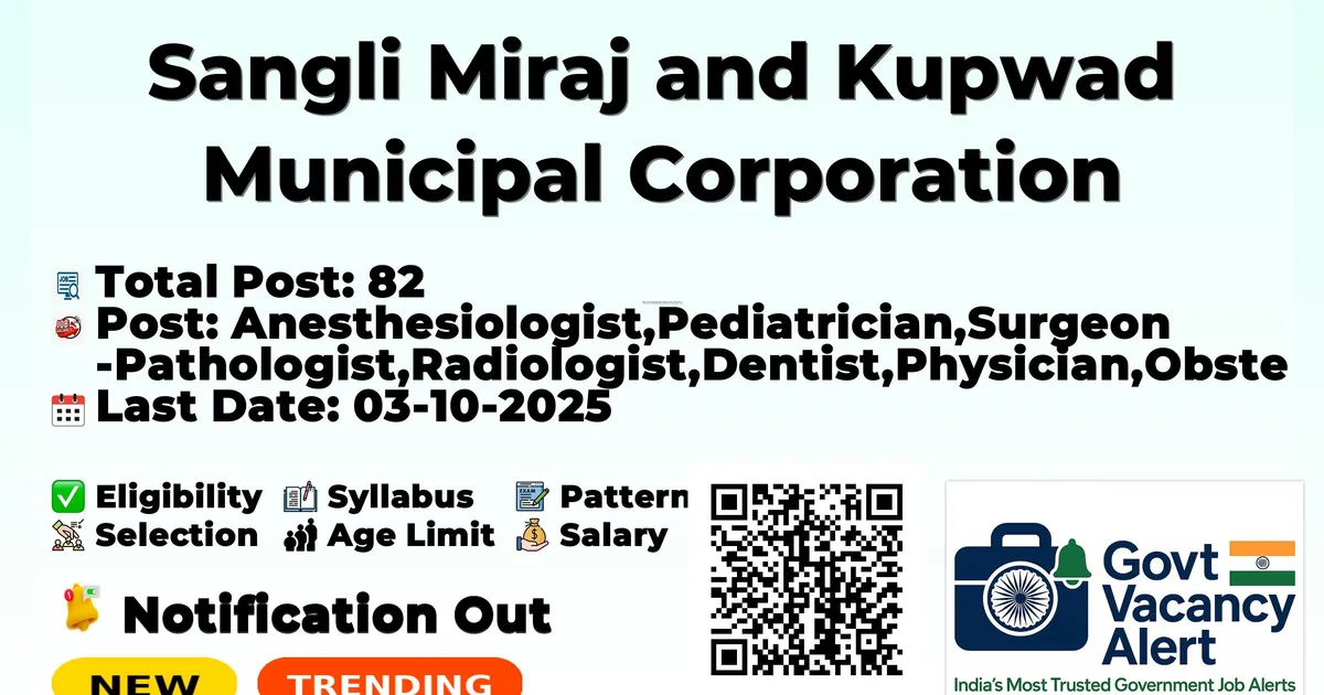 The Sangli Miraj and Kupwad Municipal Corporation Recruitment 2025 for 82 posts of Staff Nurse, Lab Technician and More. Candidates with B.Pharma, MBBS, Diploma, 12TH, GNM, D.Pharm, DMLT Can Apply Offline. The Offline application opens on 12-09-2025, and closes on 03-10-2025. The candidate shall apply Offline through Sangli Miraj and Kupwad Municipal Corporation website, nhm.maharashtra.gov.in.