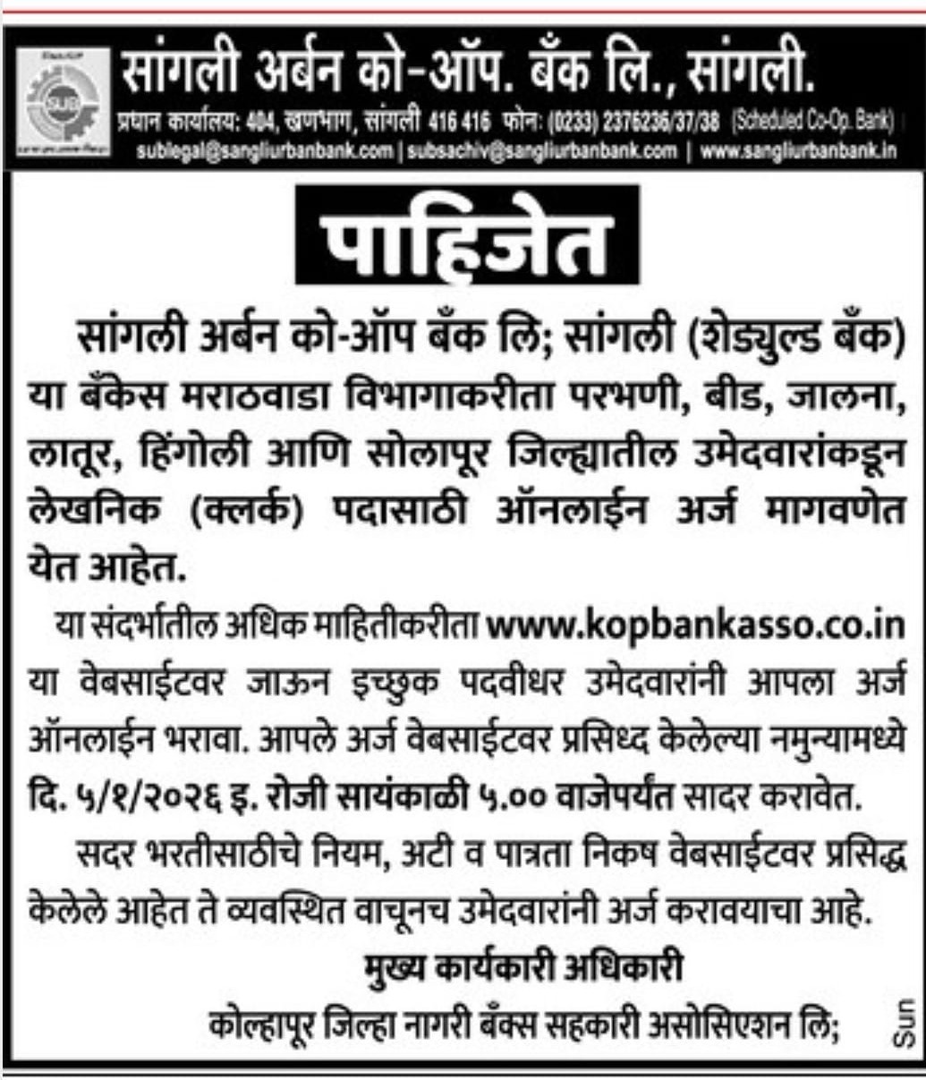 Last Date: Sangli Urban Co operative Bank Clerk 2025 WWW.FREEJOBALERT.COM Download Mobile App Application Fee Not Mentioned Sangli Urban Co operative Bank Recruitment 2025 Important Dates 05-01-2026 Sangli Urban Co operative Bank Recruitment 2025 Age Limit Age relaxation is admissible as per rules Qualification Refer Official Notification Sangli Urban Co operative Bank Recruitment 2025 Vacancy Details Post Name Total Clerk - Interested Candidates Can Read the Full Notification Before Apply Online Important Links Apply Online Click Here Notification Click Here Official Website Click Here Sarkari Result Click Here Join Telegram Channel Click Here Download Mobile App Click Here Join WhatsApp Channel Click Here