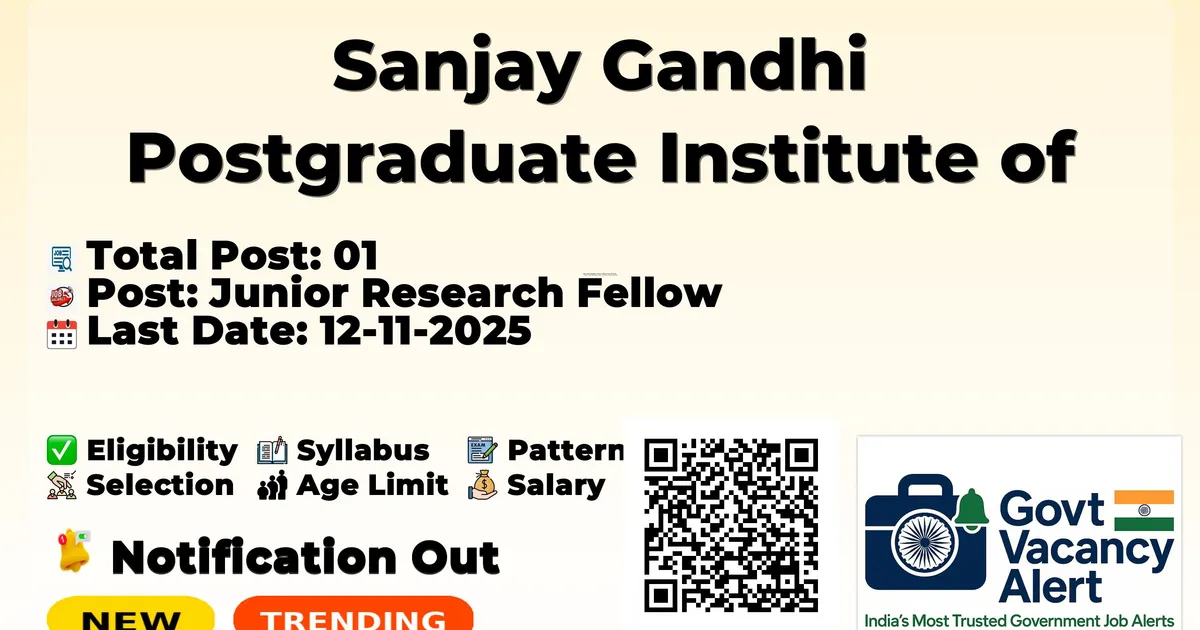 Sanjay Gandhi Postgraduate Institute of Medical Sciences (SGPGIMS) has released an official notification for the recruitment of 01 Junior Research Fellow Posts. Interested and eligible candidates can apply Offline through the official SGPGIMS website. The last date to submit the application form is 12-11-2025. In this article, you’ll find the SGPGIMS Junior Research Fellow Posts recruitment details, including eligibility criteria, age limit, salary structure, selection process, application steps, and direct links to the official notification and Offline application form.