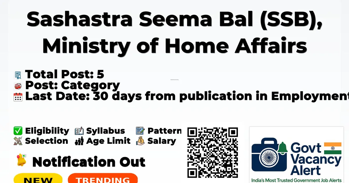 Company Name Sashastra Seema Bal (SSB), Ministry of Home Affairs Post Name Judge Attorney (Assistant Commandant) No of Posts 5 Salary Rs.56,100 – 1,77,500/- Per Month (Level-10) Qualification Degree in Law + 2 Years Experience Age Limit Maximum Age: 35 years Last Date for Apply 30 days from publication in Employment News (approx. 23-03-2026) Apply Mode Online Job Type Temporary (likely to continue) Official Website https://ssbrectt.gov.in/