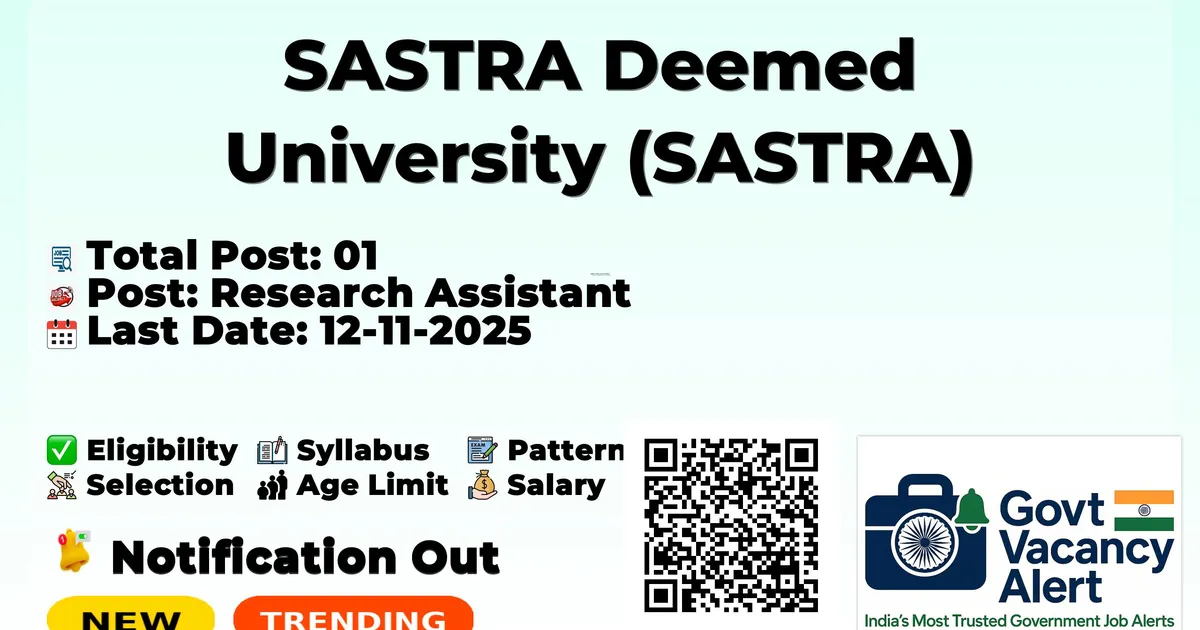SASTRA Deemed University (SASTRA) has released an official notification for the recruitment of 01 Research Assistant Posts. Interested and eligible candidates can apply Online through the official SASTRA website. The last date to submit the application form is 12-11-2025. In this article, you’ll find the SASTRA Research Assistant Posts recruitment details, including eligibility criteria, age limit, salary structure, selection process, application steps, and direct links to the official notification and Online application form. Join Our Arattai Channel: Join Here Advertisement Company Name SASTRA Deemed University (SASTRA) Post Name Research Assistant No of Posts 01 Qualification M.A, M.Phil/Ph.D Salary Rs. 30000 Last Date for Apply Online 12-11-2025 Official Website sastra.edu Postgraduate in any Social Science discipline with a minimum of 55% marks and NET / M.Phil. / Ph.D. Fellowship: Rs. 30,000/pm- Last Date for Apply Online: 12-11-2025 Shortlisted candidates will have to appear for a test and interview. The date of written test and interview will be notified by email only to the shortlisted candidates. The candidate is expected to register for Ph.D. Applicants may send their resume by email ([email protected]) to the Principal Investigator, Dr. M JAYANTHI or before 12th November 2025. Official Notification PDF: Click here Official Website: Click here Join Arattai Channel: Click Here Join Telegram Channel: Click Here Join WhatsApp Channel: Click Here Download Mobile App: Click Here Jobs In Tamil Nadu Ariyalur Chennai Chidambaram Coimbatore Cuddalore Dharmapuri Dindigul Erode Hosur Kancheepuram Kanniyakumari Karaikal Karur Krishnagiri Kumbakonam Madurai Nagapattinam Nagercoil Namakkal Nilgiris Ooty Perambalur Pudukkottai Ramanathapuram Salem Sivaganga Thanjavur Theni Thiruvallur Thiruvarur Tirunelveli Tirupathur Tiruppur Tiruvannamalai Trichy Tuticorin Vellore Viluppuram Virudhunagar Also Read SEBI Recruitment 2025 - Officer Grade A (Assistant Manager) Vacancies - Rs 62500 to 126100 Salary - Apply Now IPPB GDS Recruitment 2025 - 300+ Gramin Dak Sevaks Executive Vacancies - 30,000 Salary - Graduate Candidaes Can Apply RRB Recruitment 2025 - 2500+ JE (Junior Engineer) Vacancies - 35400 Monthly Salary - Apply Now Jobs By Education 10TH Jobs› 8TH Jobs› 12TH Jobs› Diploma Jobs› ITI Jobs› B.Tech/B.E Jobs› B.com Jobs› Any Graduate Jobs› Any Post Graduate Jobs› New Updates RRB NTPC 5,810 Online Form 2025 India Post IPPB GDS Online Form 2025 RRB 2569 JE (Junior Engineer) Online Form 2025 Territorial Army Rally 1426 Soldier Online Form 2025 Intelligence Bureau (IB) ACIO II Tech Online Form 2025 BSF 391 Constable (General Duty) Online Form 2025 SSC Delhi Police 7565 Constable Online Form 2025 UCO Bank Apprentices Online Form 2025 RRB NTPC 8850 Online Form 2025-26 View All RRB 2569 JE (Junior Engineer) Online Form 2025 RRB NTPC 12TH Level Online Form 2025 3058 Post BRO 542 MSW, Vehicle Mechanic Offline Form 2025 RITES 600 Senior Technical Assistant Online Form 2025 SSC Delhi Police 7565 Constable Online Form 2025 ISRO SDSC SHAR Various Vacancy Online Form 2025 SECL 543 Assistant Foreman Online Form 2025 ONGC 2623 Apprentices Online Form 2025 Delhi DDA Recruitment 2025 Online Form Out For 1732 Post 1. What is the last online apply date for SASTRA Research Assistant 2025? Ans: Last online apply date is 12-11-2025. 2. What is the Eligibility to apply for SASTRA Research Assistant 2025? Ans: M.A, M.Phil/Ph.D 3. How many vacancies are being recruited by SASTRA Research Assistant 2025? Ans: Total 01 Vacancies.