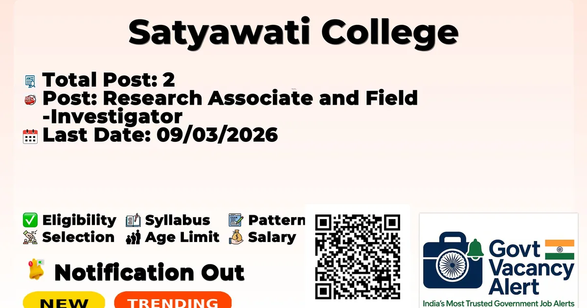 Satyawati College has released an official notification for the recruitment of 02 Research Associate, Field Investigator Posts. Interested and eligible candidates can apply Online through the official Satyawati College website. The last date to submit the application form is 09-03-2026. In this article, you’ll find the Satyawati College Research Associate, Field Investigator Posts recruitment details, including eligibility criteria, age limit, salary structure, selection process, application steps, and direct links to the official notification and Online application form.