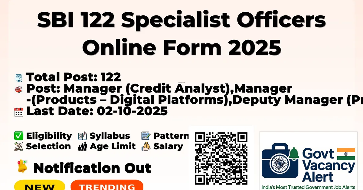 The State Bank of India (SBI) Recruitment 2025 for 122 posts of Specialist Officers. Candidates with Any Graduate, B.Tech/B.E, CA, ICWA, MBA/PGDM, MCA, PGDBM, PGDBA Can Apply Online. The online application opens on 11-09-2025, and closes on 02-10-2025. The candidate shall apply online through SBI website, sbi.bank.in.