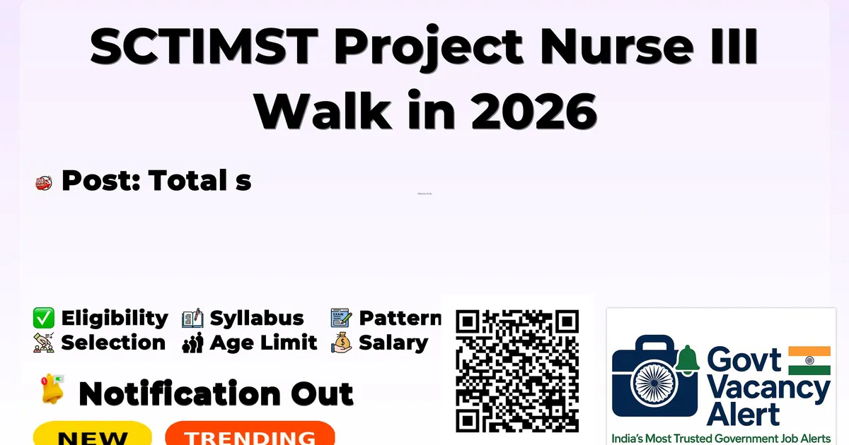 Organization Sree Chitra Tirunal Institute for Medical Sciences and Technology (SCTIMST) Post Name Project Nurse III Number of Posts 15 Advertisement Number R&P Cell/13/5508/SCTIMST/2026 Salary Rs. 28,000/- + 20% HRA Qualification Four year Nursing course from a recognized University with minimum one year clinical experience and valid Kerala Nursing Council registration Age Limit Maximum 30 years (with relaxation for Government Research Organisation experience) Notification Date 13 February 2026 Walk-in Interview Date 25 February 2026 Application Mode Walk-in Job Type Temporary