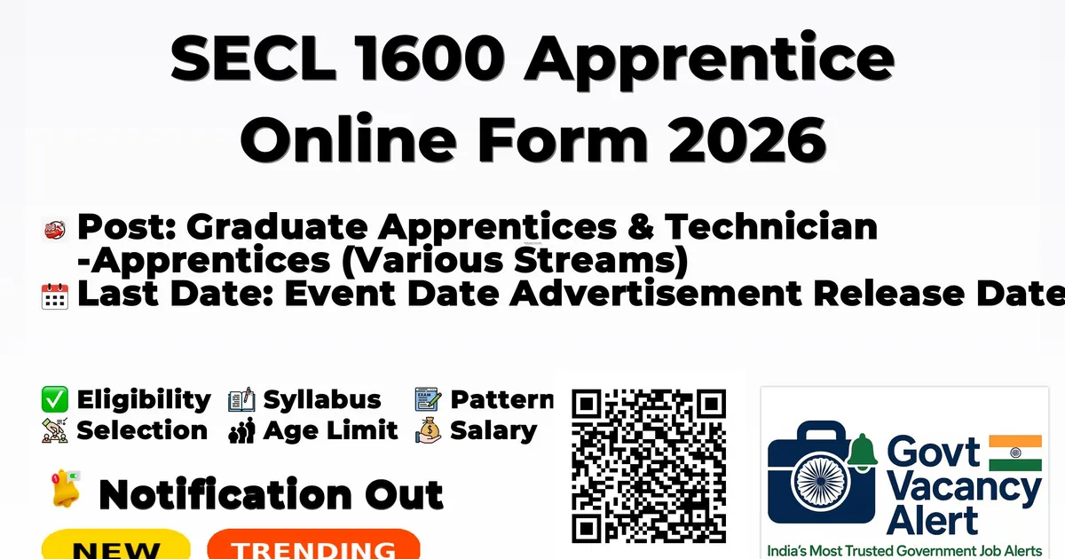 South Eastern Coalfields Limited (SECL), a Mini Ratna Company and Subsidiary of Coal India Limited has released the SECL Graduate & Technician Apprentice Recruitment 2026-27 notification for 1600 apprenticeship training posts of Graduate Apprentices and Technician Apprentices in various engineering and general streams under the Apprentices Act 1961 in Opencast/Underground Mines and Establishments of SECL.