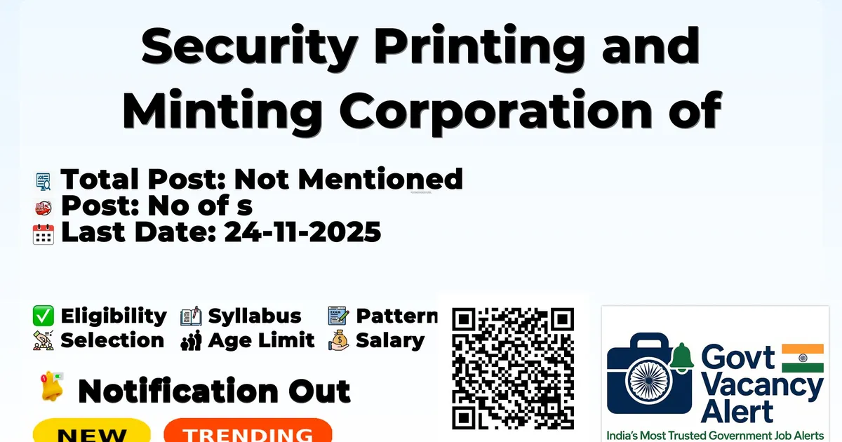 Company Name Security Printing and Minting Corporation of India (SPMCIL) Post Name Director No of Posts Not Mentioned Pay Matrix Qualification MBA/PGDM, PG Diploma Age Limit 45 to 60 years Start Date for Apply 23-10-2025 Last Date for Apply 24-11-2025 Official Website spmcil.com