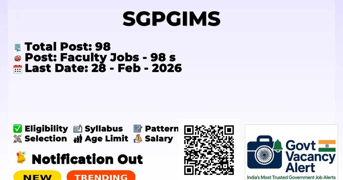 The Sanjay Gandhi Postgraduate Institute of Medical Sciences (SGPGIMS) has announced the official notification for 98 Faculty Jobs. Those candidates who have completed their MBBS, MD/ MS, DNB can grab this chance and apply for these posts. Here, we mentioned the age limit, selection process, salary structure, education details, application fee, and how to apply for the SGPGIMS Recruitment 2026. Interested candidates can apply on or before the last date of application.
