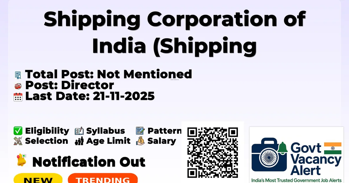Shipping Corporation of India (Shipping Corporation of India) has released an official notification for the recruitment of Director Posts. Interested and eligible candidates can apply Online through the official Shipping Corporation of India website. The last date to submit the application form is 21-11-2025. In this article, you’ll find the Shipping Corporation of India Director Posts recruitment details, including eligibility criteria, age limit, salary structure, selection process, application steps, and direct links to the official notification and Online application form.