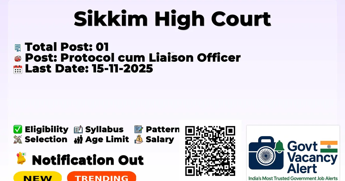 Sikkim High Court has released an official notification for the recruitment of 01 Protocol cum Liaison Officer Posts. Interested and eligible candidates can apply Offline through the official Sikkim High Court website. The last date to submit the application form is 15-11-2025. In this article, you’ll find the Sikkim High Court Protocol cum Liaison Officer Posts recruitment details, including eligibility criteria, age limit, salary structure, selection process, application steps, and direct links to the official notification and Offline application form.