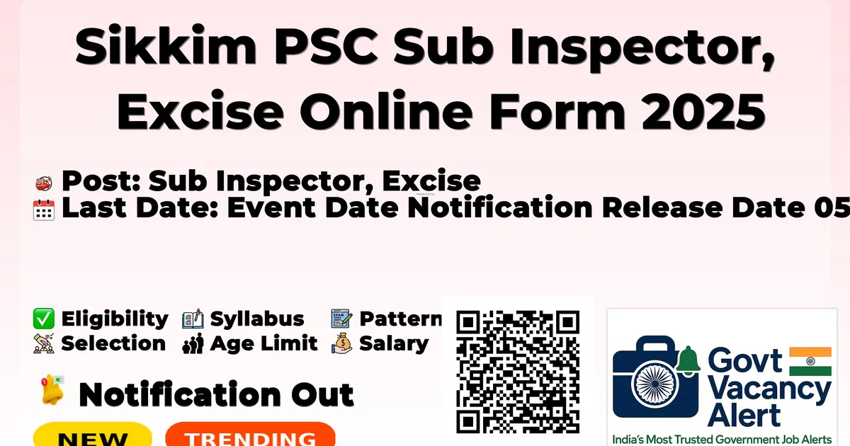 Details Information Organization Name Sikkim Public Service Commission (Sikkim PSC) Post Name Sub Inspector, Excise Total Vacancies 09 Posts Salary/Pay Scale Level 12 of the Pay Matrix (Check official notification for specific details during probation) Educational Qualification Bachelor's Degree from a recognized University Age Limit 18 to 30 years (Age relaxation as per rules) Application Start Date 05/12/2025 (Date of Notification) Application End Date 31/01/2026 Application Mode Online Official Website www.Sikkim PSCskm.gov.in