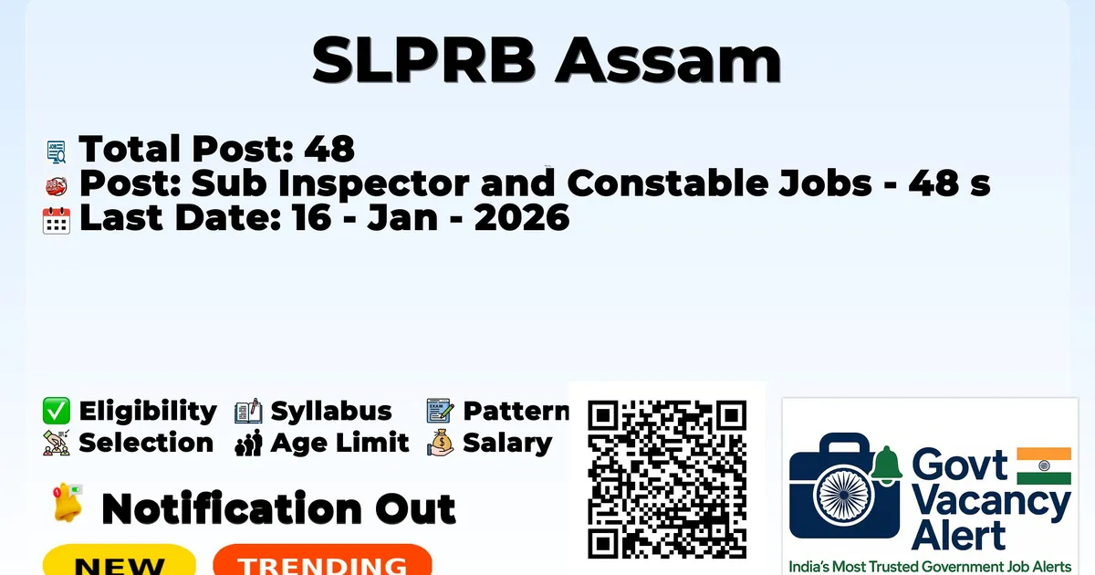 State Level Police Recruitment Board Assam (SLPRB Assam) has declared the offcial notification for 2025. To fill up the 48 vacancies for Sub Inspector and Constable Jobs. Those candidates who have qualified in Any Degree can grab this chance and apply for the SLPRB Assam Recruitment 2025. Here we include the age limit, selection process, salarystructure, education details, application fee, and how to apply online for these posts. Interested candidates can apply before the last date of application.