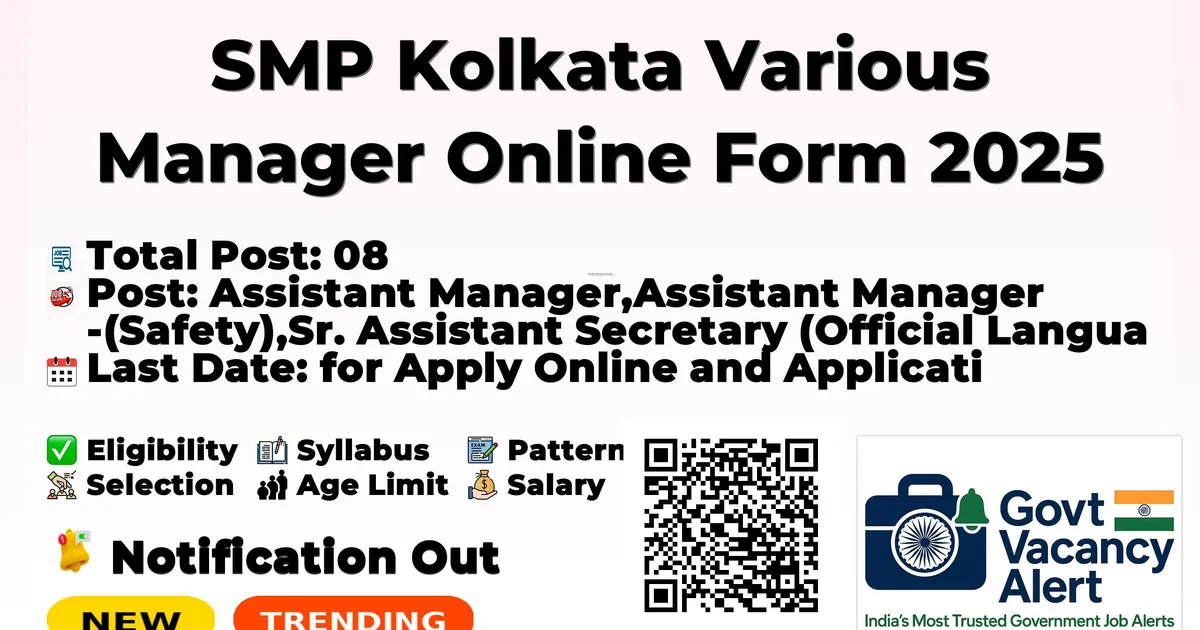 The Syama Prasad Mookerjee Port Kolkata (SMP Kolkata) Recruitment 2025 for 08 posts of Assistant Manager, Deputy Materials Manager and More. Candidates with B.Tech/B.E, Diploma, M.A, ICSI Can Apply Online. The online application opens on 15-09-2025, and closes on 24-10-2025. The candidate shall apply online through SMP Kolkata website, smp.smportkolkata.in. The SMP Kolkata Assistant Manager, Deputy Materials Manager and More Recruitment 2025 Notification PDF has been released on 13-09-2025 at smp.smportkolkata.in. Check the complete job details, vacancy, age limit, application fee, selection process and how to apply from the article. You can Check all Latest Sarkari Result Updates of All Central Government Jobs and State Government Jobs. SMP Kolkata Assistant Manager, Deputy Materials Manager and More Recruitment 2025 Notification PDF